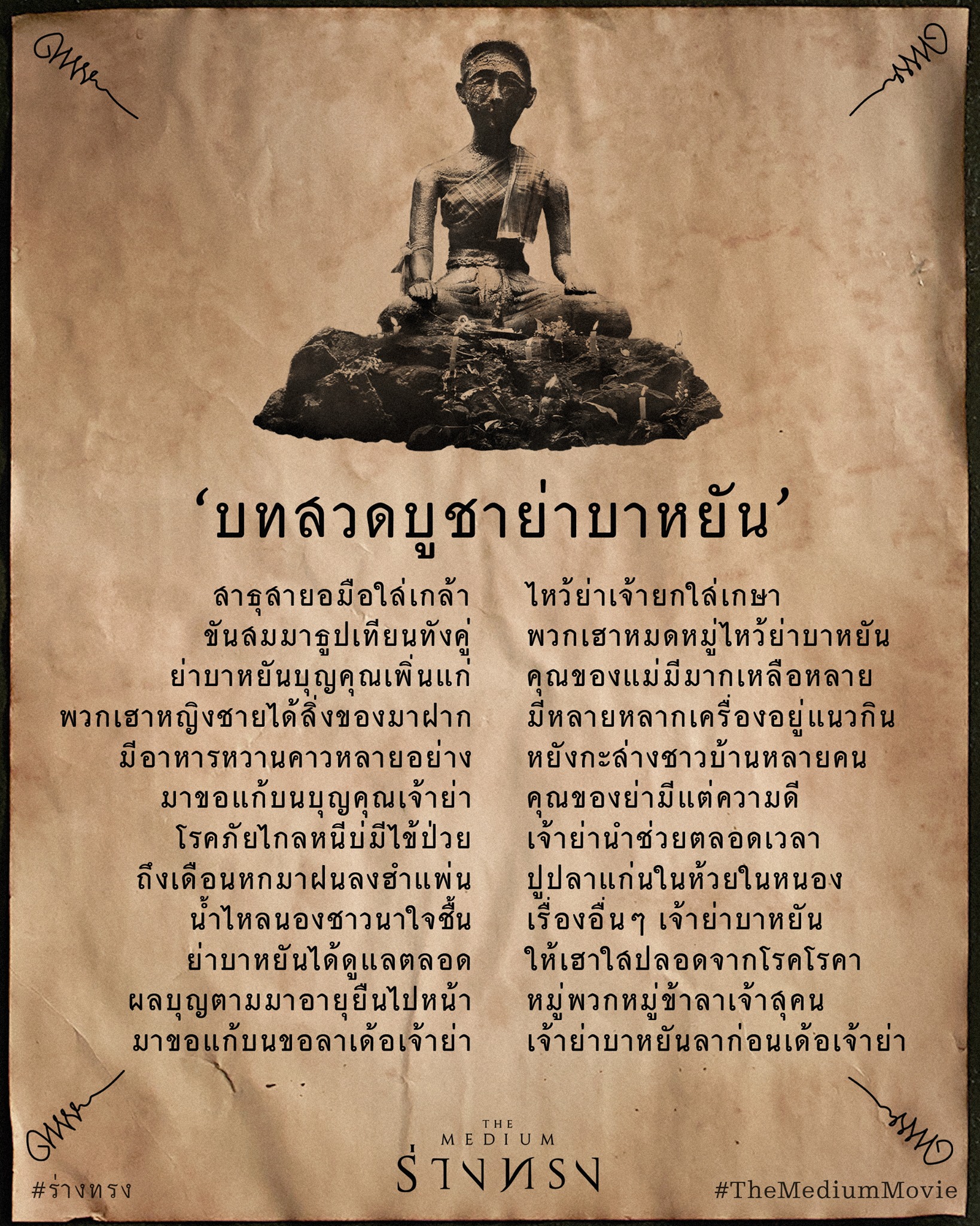 เรื่องราวของครอบครัวหนึ่งในภาคอีสานของไทยที่ได้สืบเชื้อสายร่างทรง ‘เทพบาหยัน’ มาหลายชั่วอายุคน ซึ่งเชื่อกันว่าจะเลือกแต่ร่างของผู้หญิง เพื่อสืบทอดทายาทโดยมี ‘นิ่ม’ เป็นผู้สืบทอดสายเลือดร่างทรงคนปัจจุบันก่อนที่จะพบว่าเริ่มมีอาการแปลกประหลาดหลายอย่างเกิดขึ้นกับ ‘มิ้ง’ หลานสาวคนเดียวของตระกูล ที่คาดกันว่าน่าจะถูกรับเลือก ให้เป็นทายาทร่างทรงคนต่อไป แต่มิ้งกลับมีอาการน่ากลัวขึ้นเรื่อยๆ จนสมาชิกในครอบครัวเริ่มสงสัยกันว่า สิ่งที่เข้ามาอยู่ในร่างของมิ้ง อาจจะไม่ใช่เทพบาหยันอย่างที่ทุกคนคิด โดยล่าสุดทาง GDH ได้เผยคำสวดบูชาของย่าบาหยัน ให้เหล่าลูกหลาน ได้สวดสักการะเพื่อให้ย่าดลบันดาลความสุขแด่ชีวิต