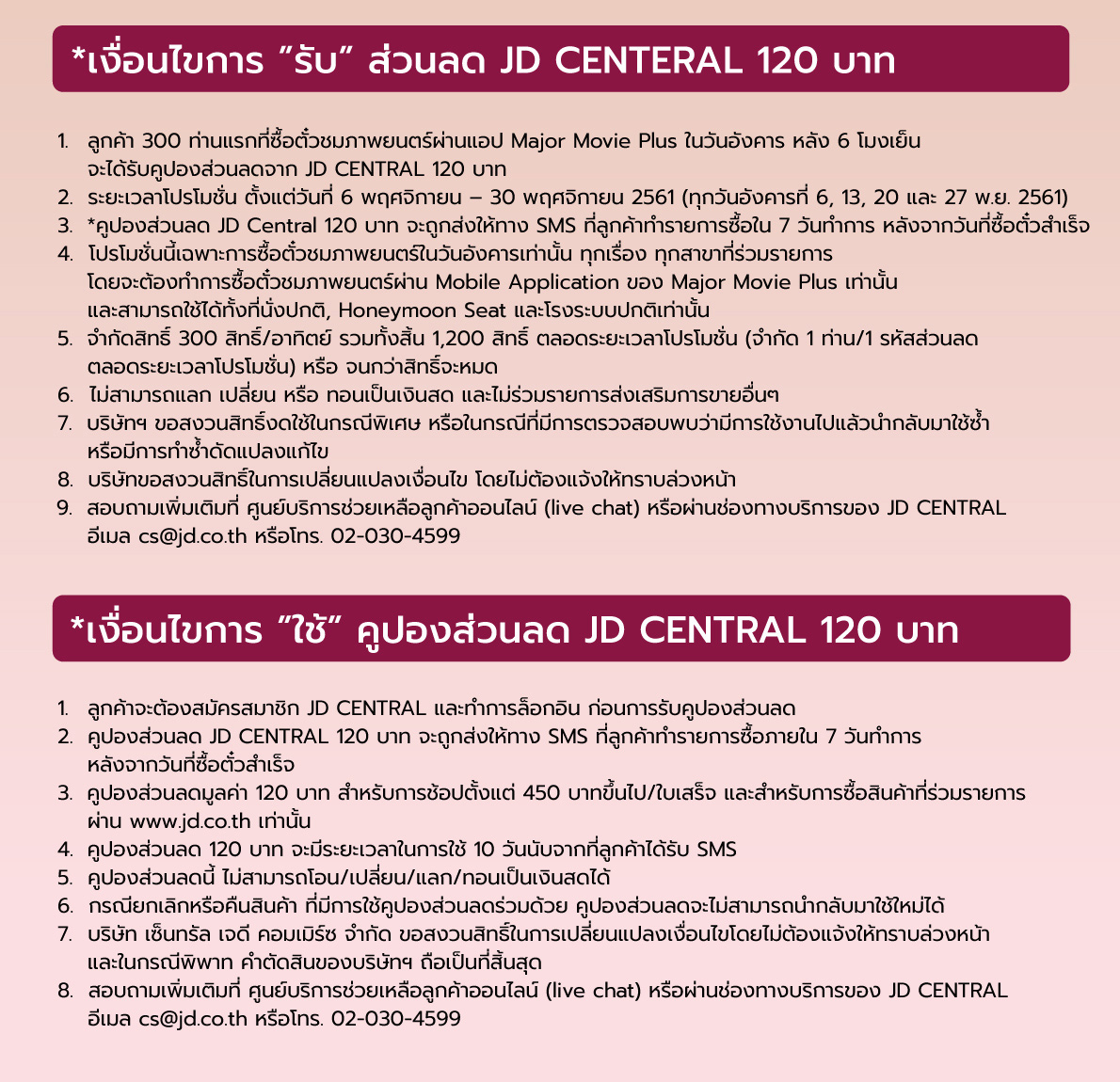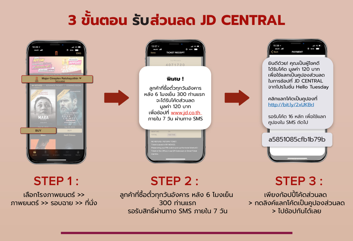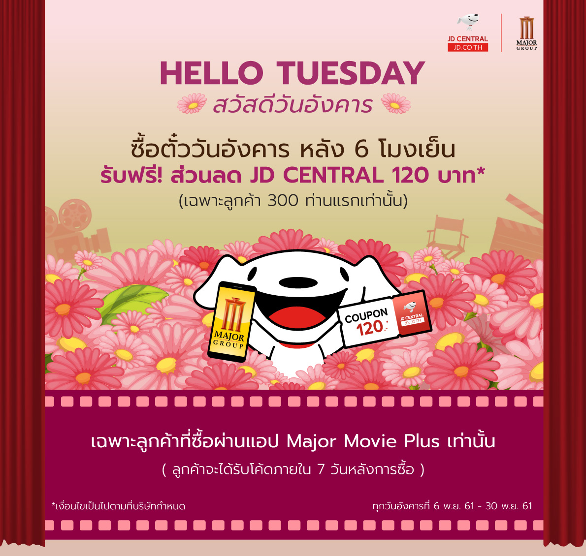 Hello Tuesday ซื้อตั๋วหนังวันอังคาร หลัง 6 โมงเย็น รับฟรี ส่วนลด JD Central 120 บาท