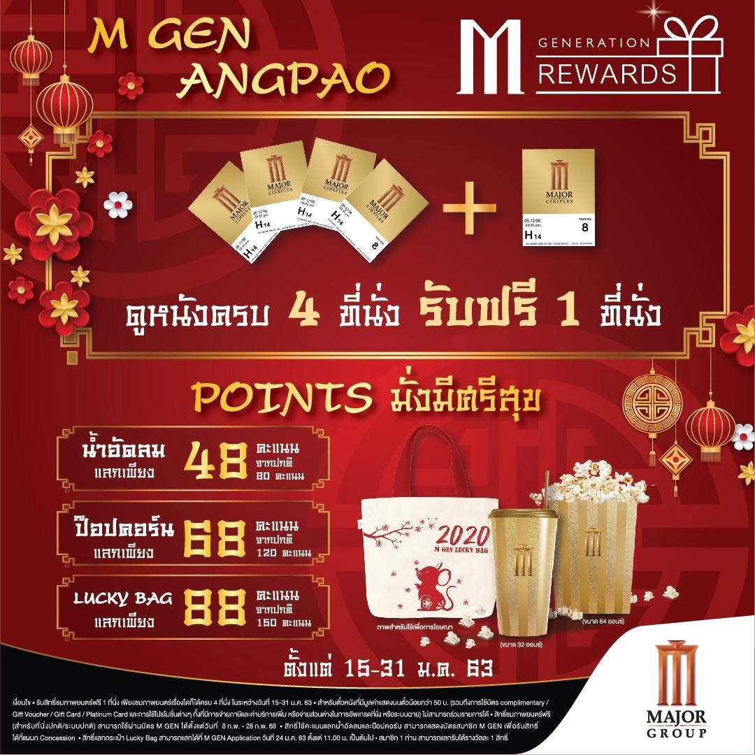 M GEN Angpao สมาชิก M GEN รับสิทธิ์ชมภาพยนตร์ ฟรี 1 ที่นั่ง เมื่อชมภาพยนตร์ครบ 4 ที่นั่ง พร้อมใช้คะแนนพิเศษแลกรับของรางวัล ต้อนรับตุรษจีน