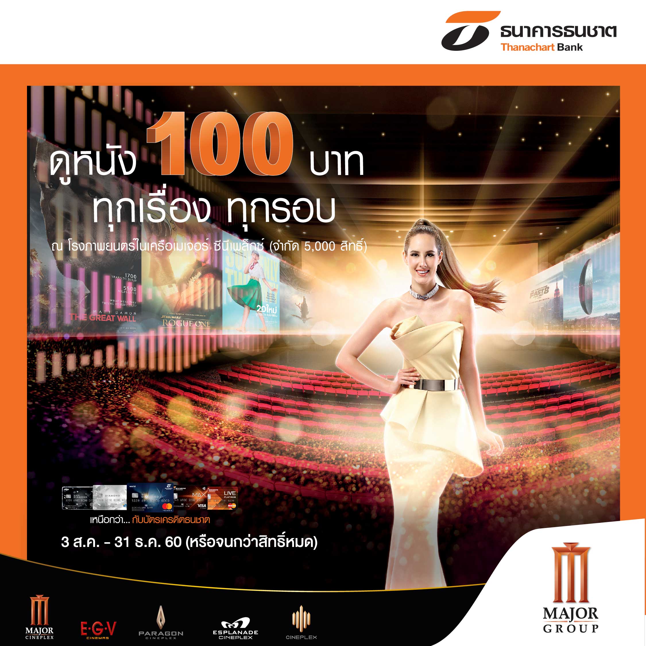 เงื่อนไข : ลูกค้าบัตรเครดิต ธนชาต ซื้อบัตรชมภาพยนต์ ในราคา 100 บาท (จำกัดบัตรสูงสุด 4 สิทธิ์ / บัตร / เดือน)