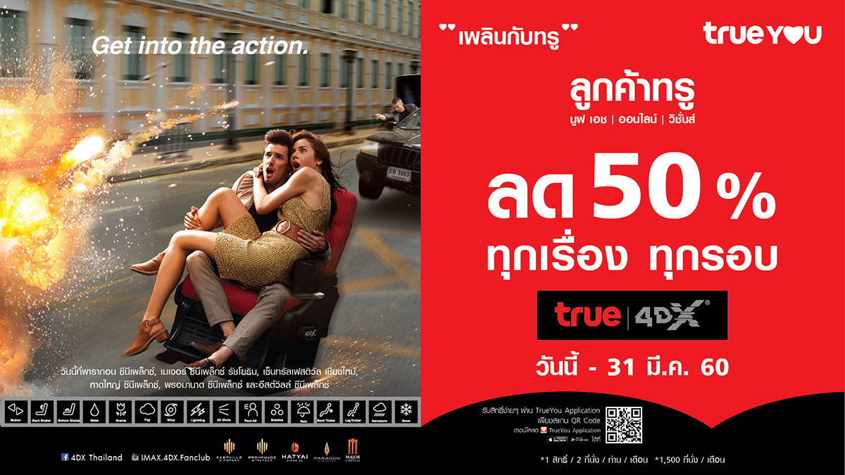 สิทธิพิเศษสำหรับลูกค้าทรูรับสวนลด 50% บัตรชมภาพยนตร์ที่ True 4DX ทุกสาขา