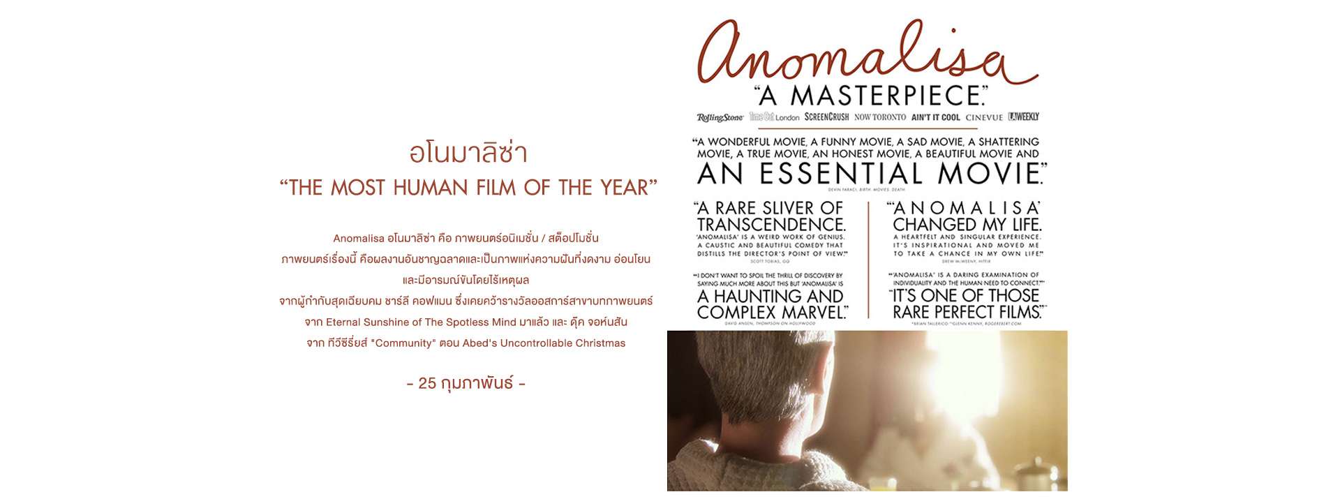 Anomalisa อโนมาลิซ่า เป็นการถ่ายทอดเรื่องราวของชายคนหนึ่ง ซึ่งอยู่ในช่วงวิกฤติชีวิต เกิดปัญหาในด้านปฏิสัมพันธ์กับคนอื่น ไมเคิล สโตน ซึ่งเป็นทั้งสามี, พ่อ และนักเขียนเจ้าของผลงาน "How May I Help You Help Them?" ผู้ซึ่งสภาพจิตใจตกอยู่ในสภาวะสับสน ในระหว่างการเดินทางไปบรรยายในการประชุมของผู้ประกอบวิชาชีพด้านบริการลูกค้าที่ซินซินนาติ เขาเข้าพักที่โรงแรมเฟรโกลีและได้หลุดพ้นจากความสิ้นหวัง เมื่อได้พบกับลิซ่า สาวตัวแทนฝ่ายขายของสินค้าเบเกอรี่จากเอครอน ซึ่งเธอคนนี้อาจจะเป็นรักแท้ของเขาหรืออาจจะไม่ใช่ก็ได้