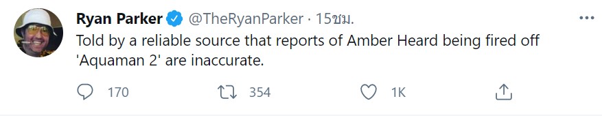 แต่ดูเหมือนว่าข่าวลือนั้นจะถูกปัดตกลงไปแล้ว เพราะล่าสุด Ryan Parker ผู้สื่อข่าวจากสื่อใหญ่อย่าง The Hollywood Reporter ก็ได้ออกมาอัพเดตผ่านทวิตเตอร์ส่วนตัวของตัวเองว่า ข่าวลือที่ เอมเบอร์ เฮิร์ด ถูกถอดออกจากบทใน Aquaman 2 นั้น ไม่เป็นความจริง เขาระบุเอาไว้ว่า…