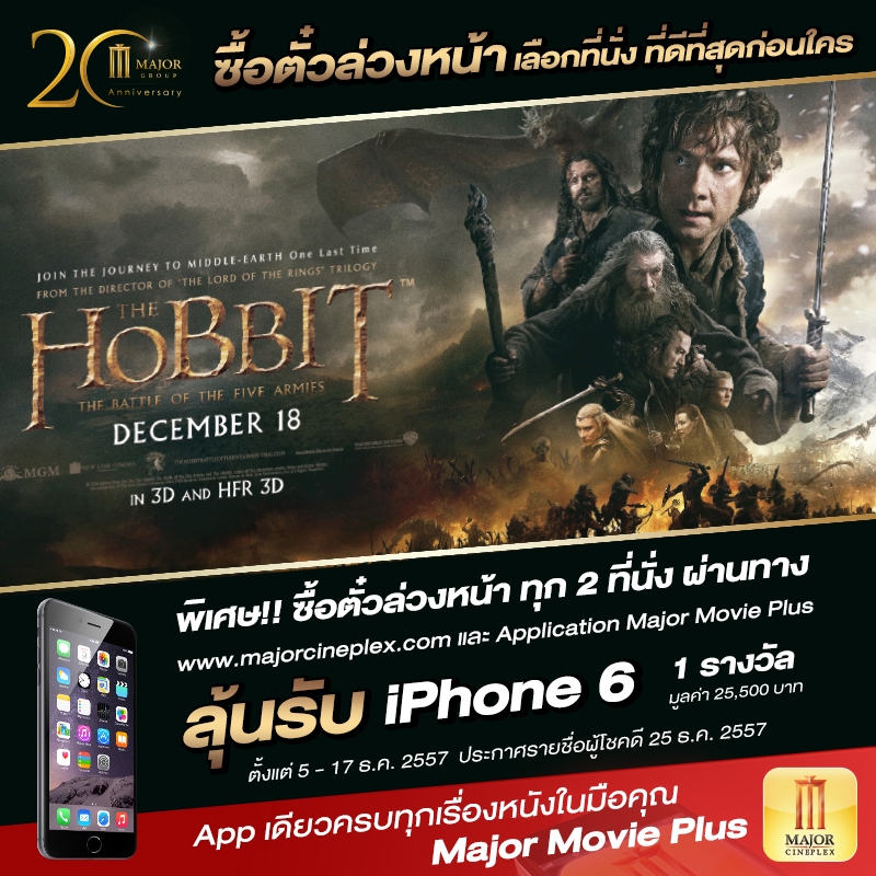 - สิทธิพิเศษเฉพาะลูกค้าที่ซื้อบัตรชมภาพยนตร์ล่วงหน้า เรื่อง The Hobbit: The Battle of the Five Armies ผ่านทาง Application “Major Movie Plus” และเว็บไซต์ www.majorcineplex.com โดยทำรายการชำระเงินผ่านเว็บไซต์ และ Application เท่านั้น