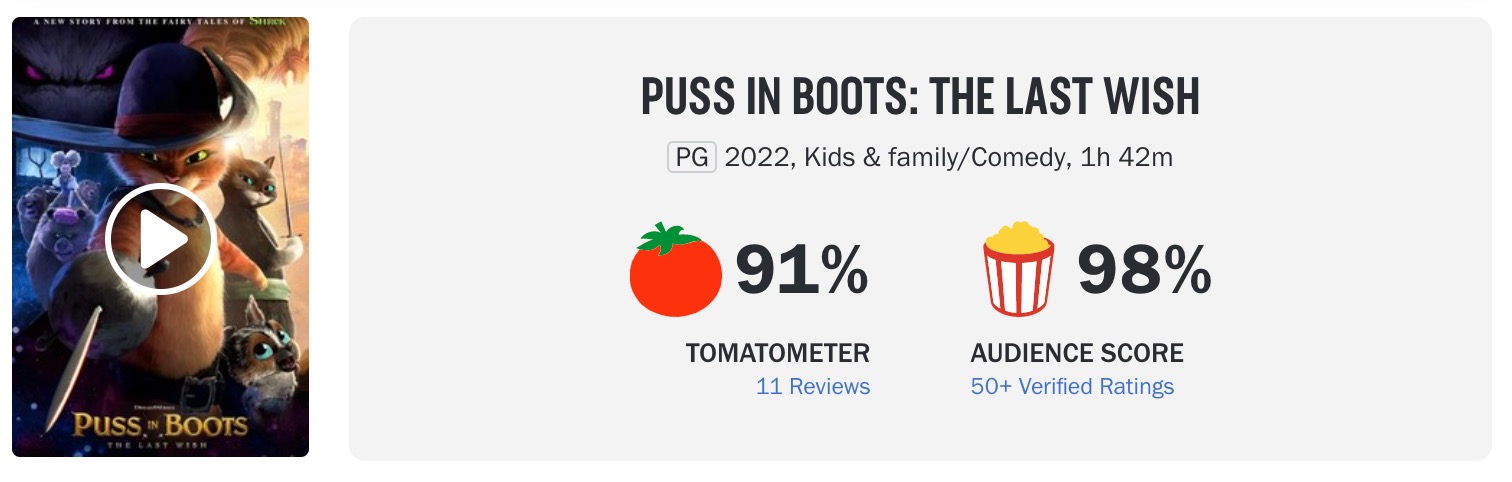PUSS IN BOOTS: THE LAST WISH แอนิเมชั่นภาคต่อของ PUSS IN BOOTS ตัวละครในจักรวาลแอนิเมชั่น Shrek ได้เข้าฉายให้กับกลุ่มสื่อและนักวิจารณ์บางส่วนได้ชมแล้ว โดยคะแนนเปิดบนเว็บไซต์ https://www.rottentomatoes.com/ ได้ให้คะแนนความสดไปถึง 91% จาก 11 รีวิวของนักวิจารณ์ในขณะที่คนดู มากกว่า 50 คน ได้เทคะแนนไปที่ 98% โดยความเห็นของผู้ชมที่ได้ดูแล้วลงความเห็นว่า เป็นหนึ่งในแอนิเมชั่นที่ดูสนุกมากว่าที่คาดคิดไว้ มีความนุ่มนวล อ่อนโยนในแบบที่ทาสแมวต้องหลงรัก มีมุกตลก มีความสนุกในแบบเด็กๆ ทำให้สมาชิกทุกคนในครอบครัวได้เติมเต็มความสุข