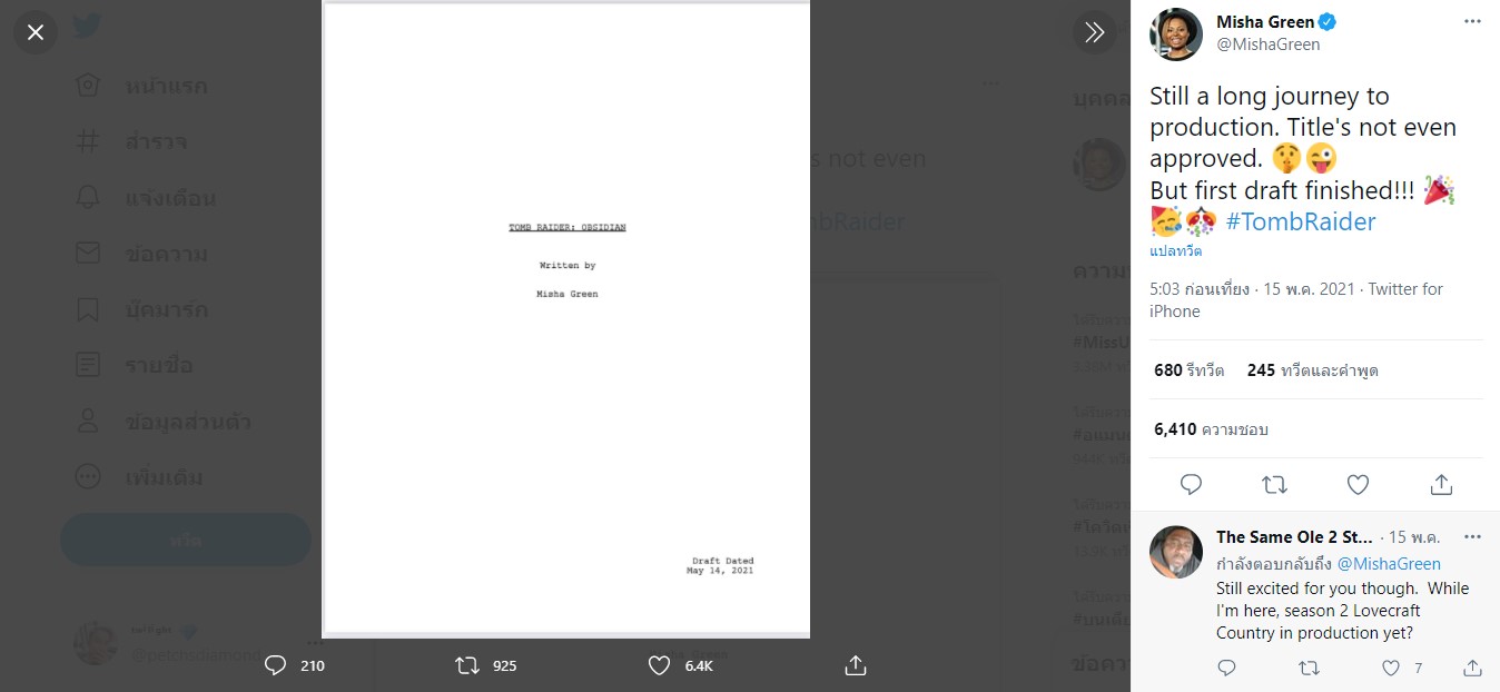 ล่าสุด Misha Green ผู้กำกับ พ่วงหน้าที่เขียนบทภาพยนตร์ของ Tomb Raider 2 ก็ได้อัพเดตภาพใหม่ เป็นหน้าปกของบทภาพยนตร์ที่เธอดูแลเรื่องนี้ พร้อมกับแคปชั่นว่า… ยังอีกไกลกว่าจะถึงช่วงงานสร้าง ชื่อหนังยังไม่ได้รับการอนุมัติ แต่ร่างบทแรกเสร็จเรียบร้อยแล้ว! #Tomb Raider