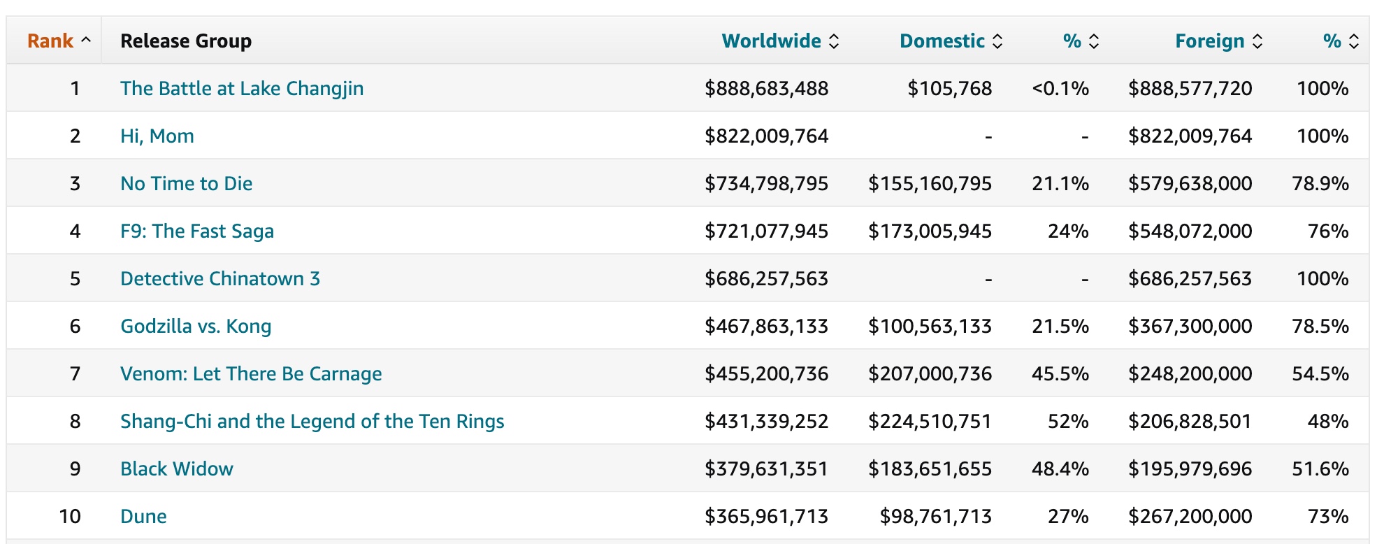 เว็บไซต์ Boxofficemojo.com รายงานอันดับหนังทำเงินสูงสุดประจำปี 2021 โดยล่าสุด Venom: Let There Be Carnage รายได้รวมทั่วโลกอยู่ที่ $455,200,736 ดอลล่าร์สหรัฐฯ อยู่ในตารางอันดับ 7 และถือเป็นหนังหมวดซูเปอร์ฮีโร่อันดับ 1 ตอนนี้ แซงหน้า Shang-Chi and the Legend of the Ten Rings และ Black Widow โดย Venom: Let There Be Carnage มีกำหนดฉายรอบพิเศษ 25 - 30 พ.ย.นี้ รอบ 1 ทุ่มเป็นต้นไป และมีกำหนดฉายจริง 1 ธันวาคมนี้