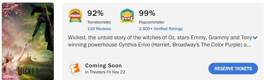 หลังจากการฉายรอบพิเศษของ Wicked เว็บไซต์ Rotten Tomatoes เผยว่า ณ ตอนนี้ คะแนนจากผู้ชมของภาพยนตร์อยู่ที่ระดับน่าประทับใจที่ 99% คะแนนนี้อาจเปลี่ยนแปลงเมื่อมีรีวิวเพิ่มขึ้น แต่คะแนน 99% นี้มาจากคะแนนที่ผ่านการยืนยันมากกว่า 1,000 รายการ ซึ่งหมายความว่าทางเว็บไซต์ได้ตรวจสอบแล้วว่าผู้ให้คะแนนเป็นผู้ถือตั๋วจริง ส่วนคะแนนจากนักวิจารณ์ล่าสุดอยู่ที่ 92%