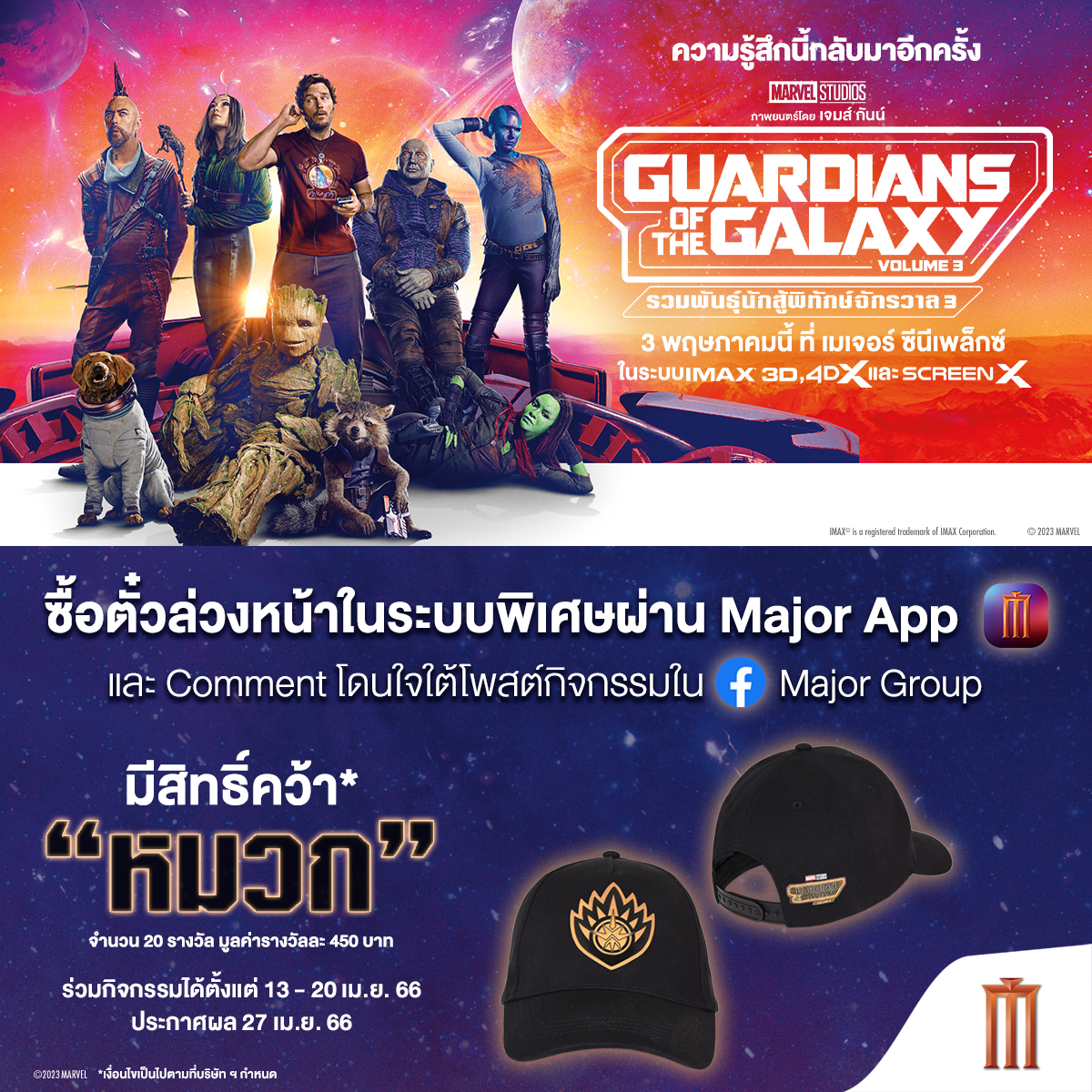 โปรโมชันซื้อตั๋วชมภาพยนตร์ล่วงหน้า “Guardians of the Galaxy Vol.3” ผ่าน Major App ในระบบพิเศษระบบใดก็ได้ ได้แก่ IMAX 3D/ 4DX/ ScreenX จำนวน 2 ที่นั่งขึ้นไป ระหว่าง 13-20 เม.ย. 66 รับสิทธิ์คว้า “หมวก Guardians of the Galaxy” จำนวน 20 รางวัล (มูลค่าใบละ 450 บาท)