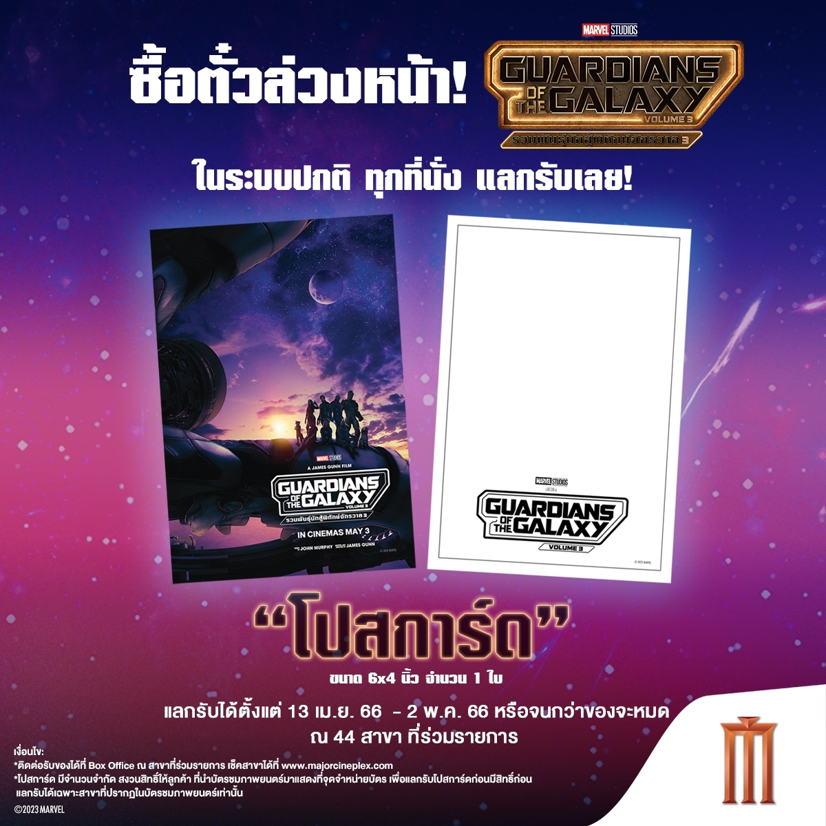 · ซื้อบัตรชมภาพยนตร์ Advance Ticket “GUARDIANS OF THE GALAXY VOL. 3” ทุก 1 ที่นั่ง (เฉพาะระบบปกติ) สามารถแลกรับโปสการ์ดได้ฟรี 1 แผ่น