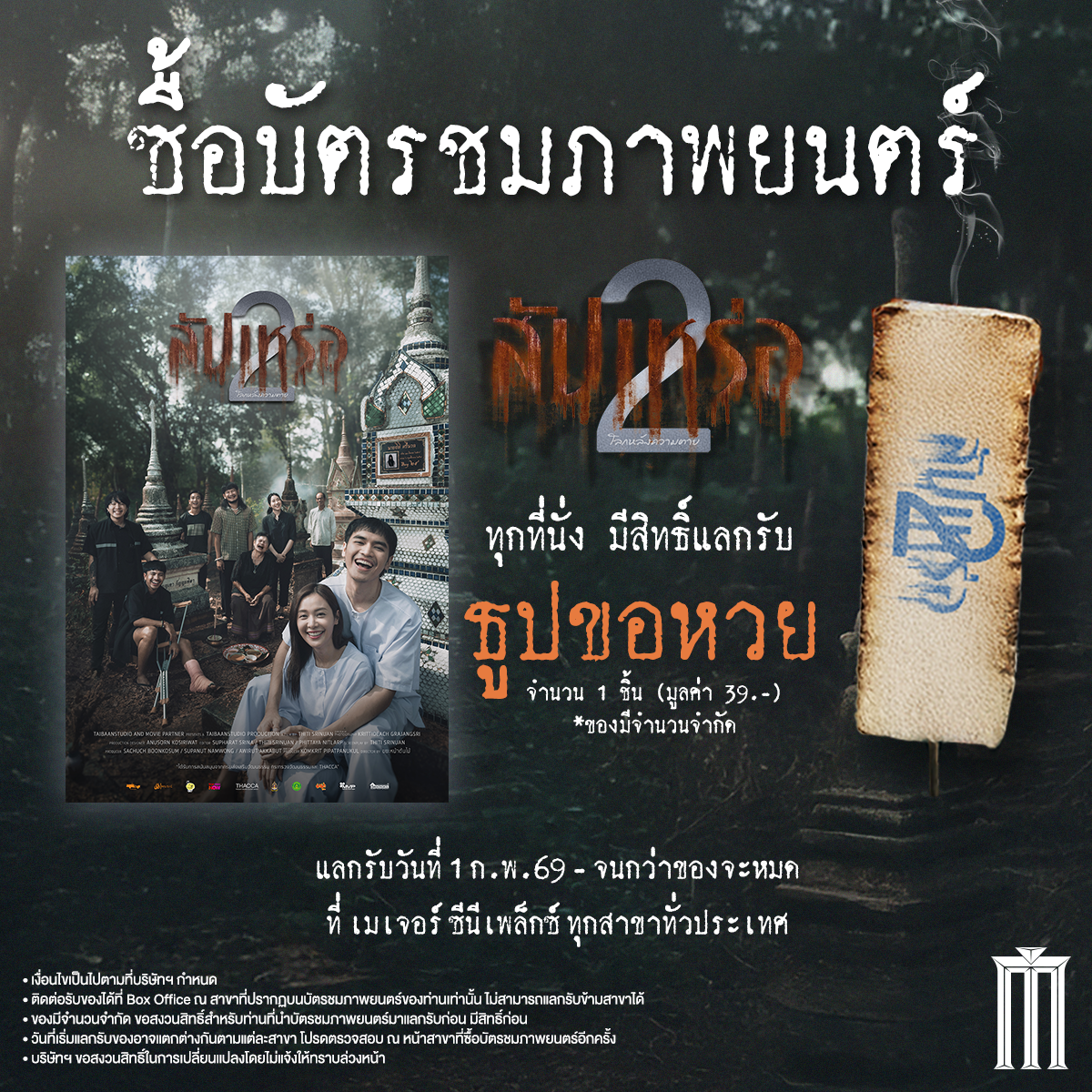 • ซื้อบัตรชมภาพยนตร์ Advance Ticket เรื่อง “สัปเหร่อ 2” ทุกที่นั่ง แลกรับ “ธูปขอหวย” จำนวน 1 ชิ้น
