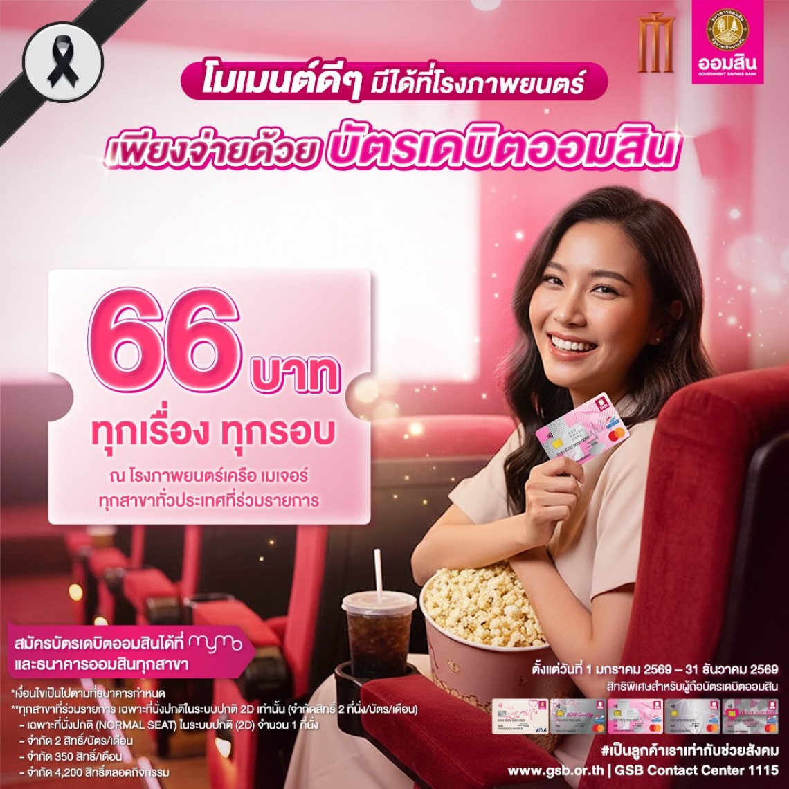• สิทธิพิเศษเฉพาะ ลูกค้าบัตรเดบิต ธนาคารออมสิน รับสิทธิพิเศษใช้บัตรเดบิต ซื้อตั๋วหนังด้วยบัตรเดบิตในราคา 66 บาท (เฉพาะบัตรที่ร่วมรายการ)