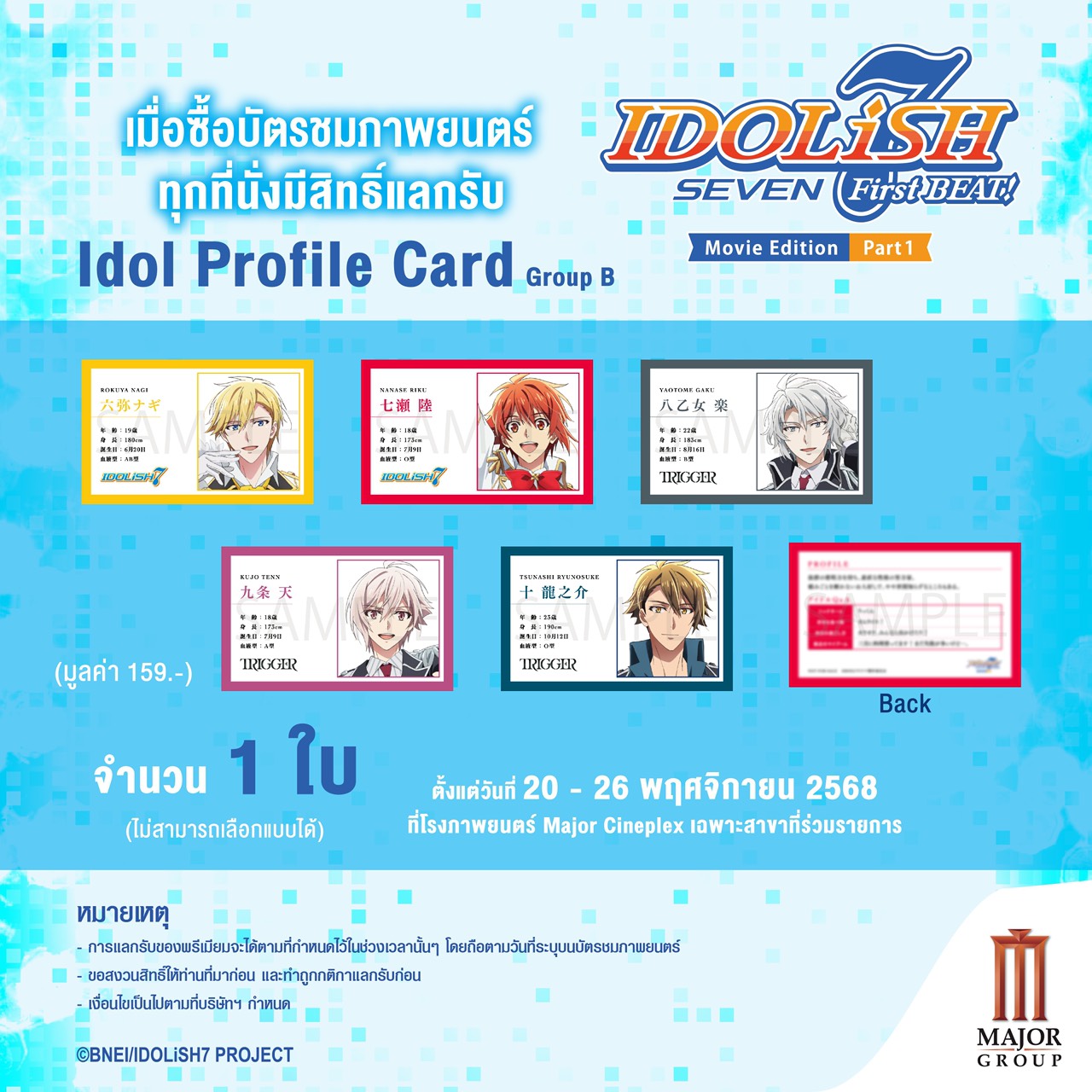 • ซื้อบัตรชมภาพยนตร์เรื่อง IDOLiSH7 ทุกที่นั่ง มีสิทธิ์รับ Idol Profile Card จำนวน 1 ใบ (แบบสุ่ม ไม่สามารถเลือกลายได้) มูลค่า 159 บาท