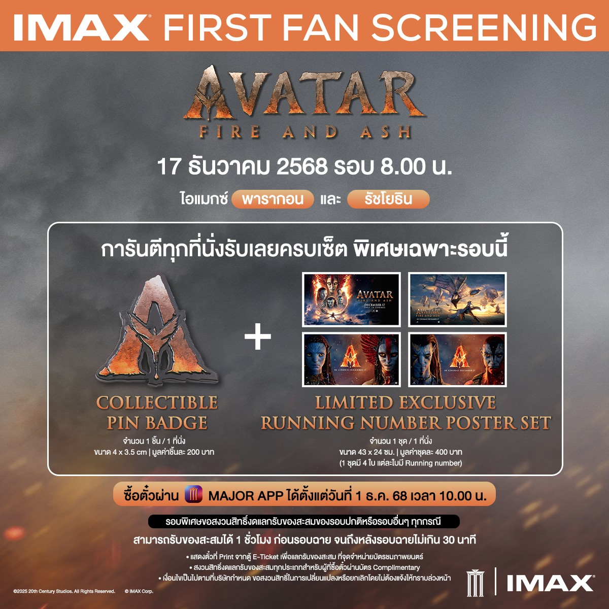 1. รอบพิเศษ IMAX First Fan Screening Avatar: Fire and Ash ชมก่อนใคร! พร้อมของสะสมครบเซ็ต พิเศษเฉพาะรอบ 08.00 น. วันที่ 17 ธ.ค. 2568 ที่ IMAX with Laser พารากอน ซีนีเพล็กซ์ และ เมเจอร์ ซีนีเพล็กซ์ รัชโยธิน เท่านั้น