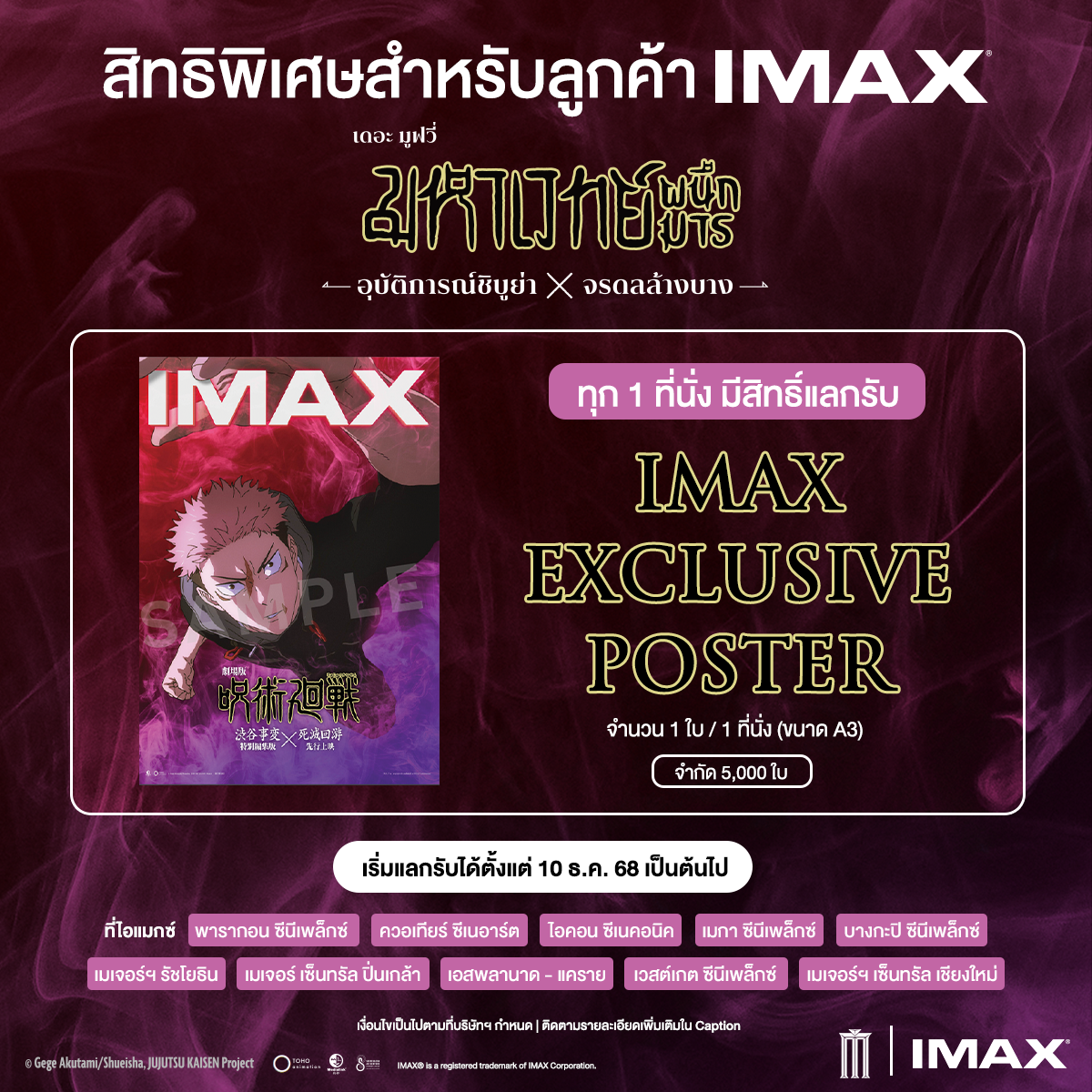 • สิทธิพิเศษเฉพาะลูกค้า IMAX ซื้อตั๋วชมภาพยนตร์ “มหาเวทยท์ผนึกมาร มูฟวี่ อุบัติการณ์ชิบูย่า x จรดลล้างบาง” ในระบบ IMAX ทุก 1 ที่นั่ง รับ IMAX Exclusive Poster จำนวน 1 ใบ