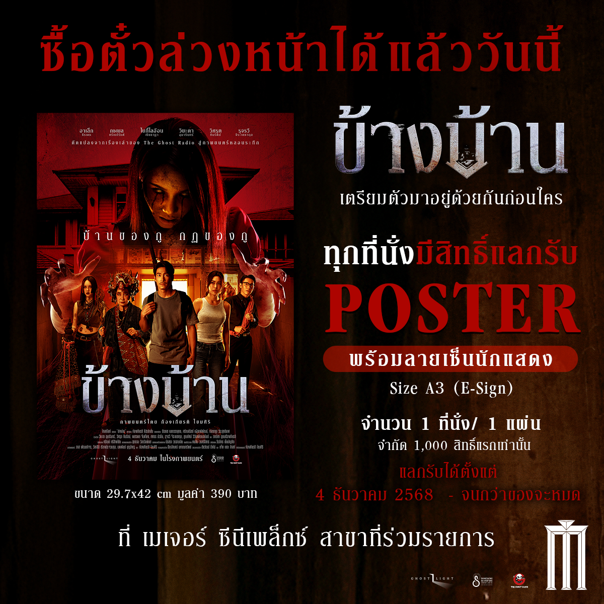 • เฉพาะลูกค้าที่ซื้อบัตรชมภาพยนตร์เรื่อง “ข้างบ้าน” ทุกที่นั่งรับ Poster A3 1 ใบ