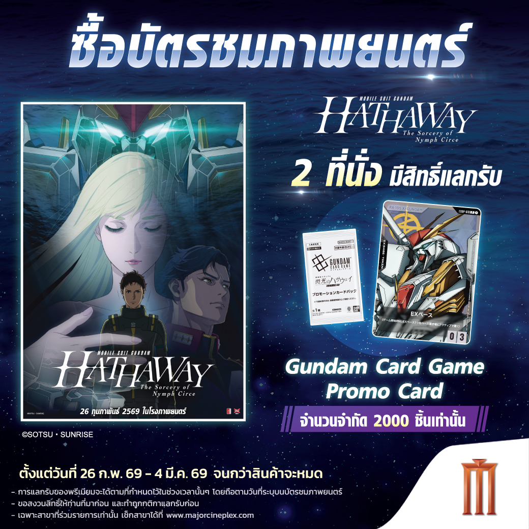 •  ซื้อบัตรชมภาพยนตร์ MOBILE SUIT GUNDAM HATHAWAY The Sorcery of Nymph Circe ทุก 2 ที่นั่ง มีสิทธิ์รับ Gundam Card Game Promo Card จำนวน 1 ใบ (แจกแบบสุ่ม ไม่สามารถเลือกแบบได้)