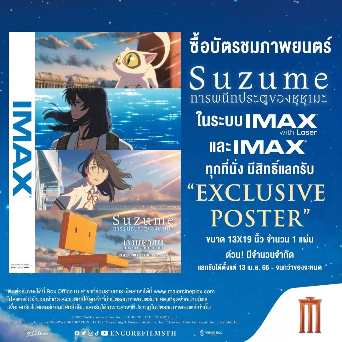 · ซื้อบัตรชมภาพยนตร์ “SUZUME” เฉพาะระบบ IMAX ทุก 1 ที่นั่ง สามารถแลกรับโปสเตอร์ IMAX ได้ฟรี 1 แผ่น