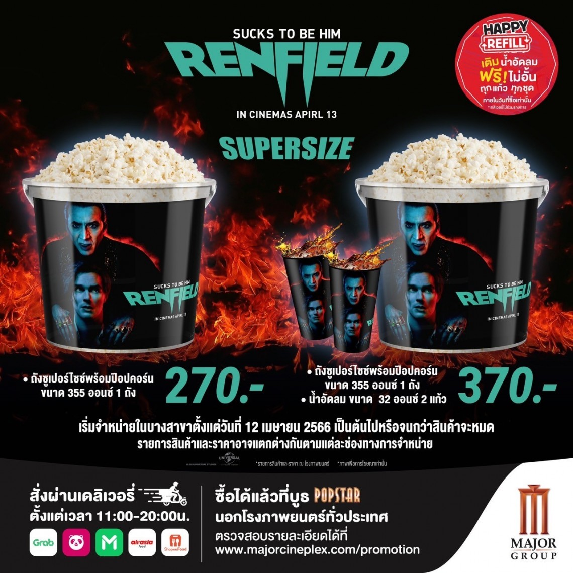 1. รับสิทธิ์เติมน้ำอัดลมฟรี ไม่จำกัดจำนวนครั้ง โดยนำใบเสร็จที่ซื้อสินค้า ที่ร่วมรายการมาแสดงที่จุดจำหน่ายป๊อปคอร์นและเครื่องดื่ม เพื่อแลกรับสิทธิ์ (การซื้อผ่าน Delivery ไม่ร่วมรายการ)