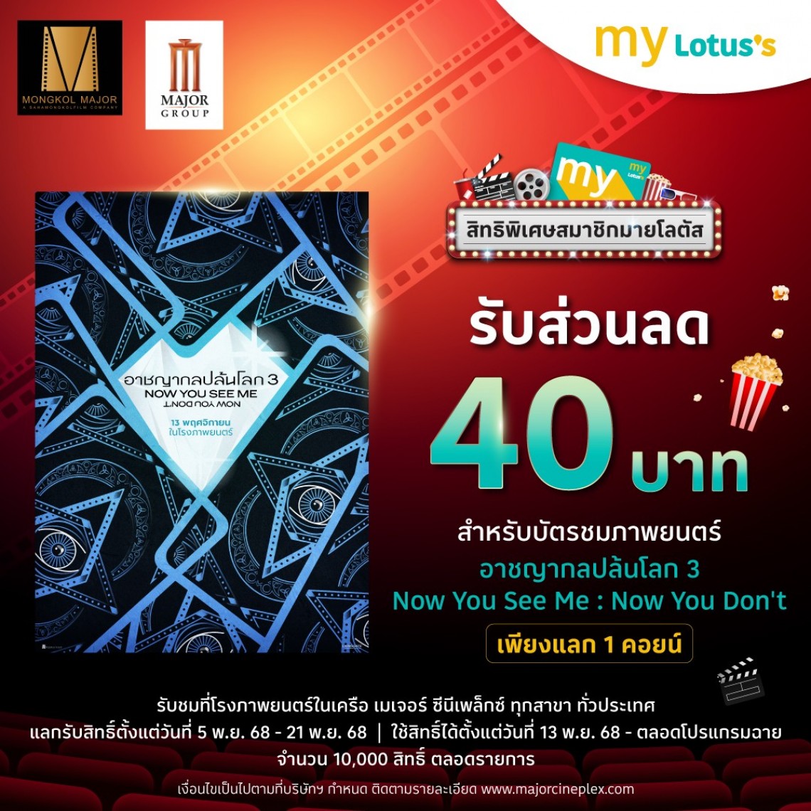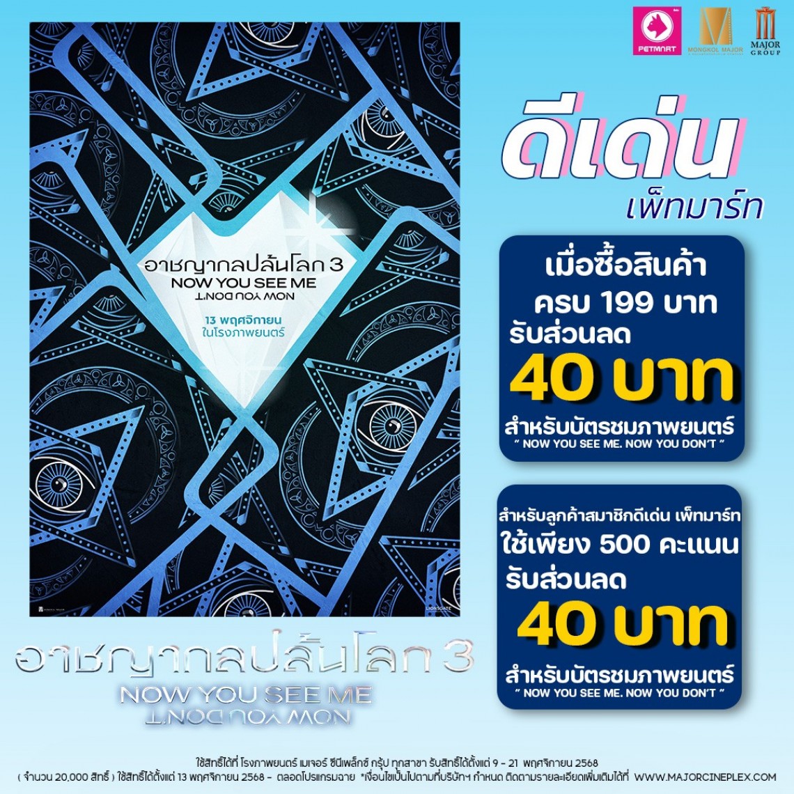โปรโมชั่นส่วนลด 40 บาท บัตรชมภาพยนตร์เรื่อง Now You See Me 3 x ดีเด่น เพ็ทมาร์ท