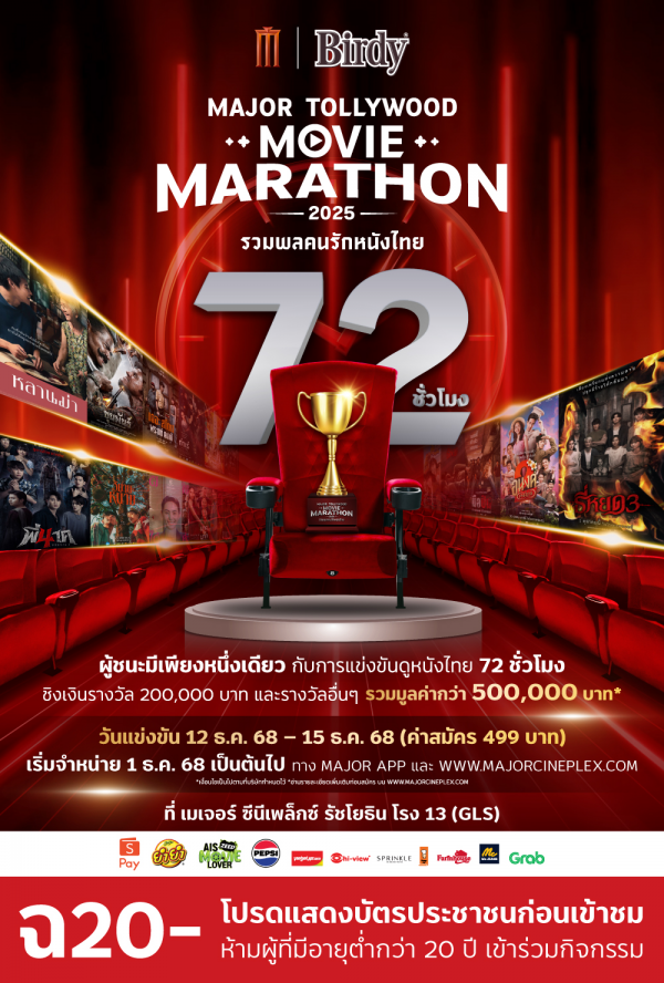 กลับมาอีกครั้งกับ Major Movie Marathon 2025 รวมพลคนรักหนังไทย การแข่งขันดูหนังกว่า 72 ชั่วโมง โดยสามารถสมัครเข้าร่วมแข่งขัน ได้ตั้งแต่วันที่ 1 ธันวาคม 2568 ทางแอปพลิเคชัน MAJOR APP หรือทางเว็บไซต์ www.majorcineplex.com โดยผู้เข้าร่วมต้องมีอายุ 20 ปีบริบูรณ์ขึ้นไป
