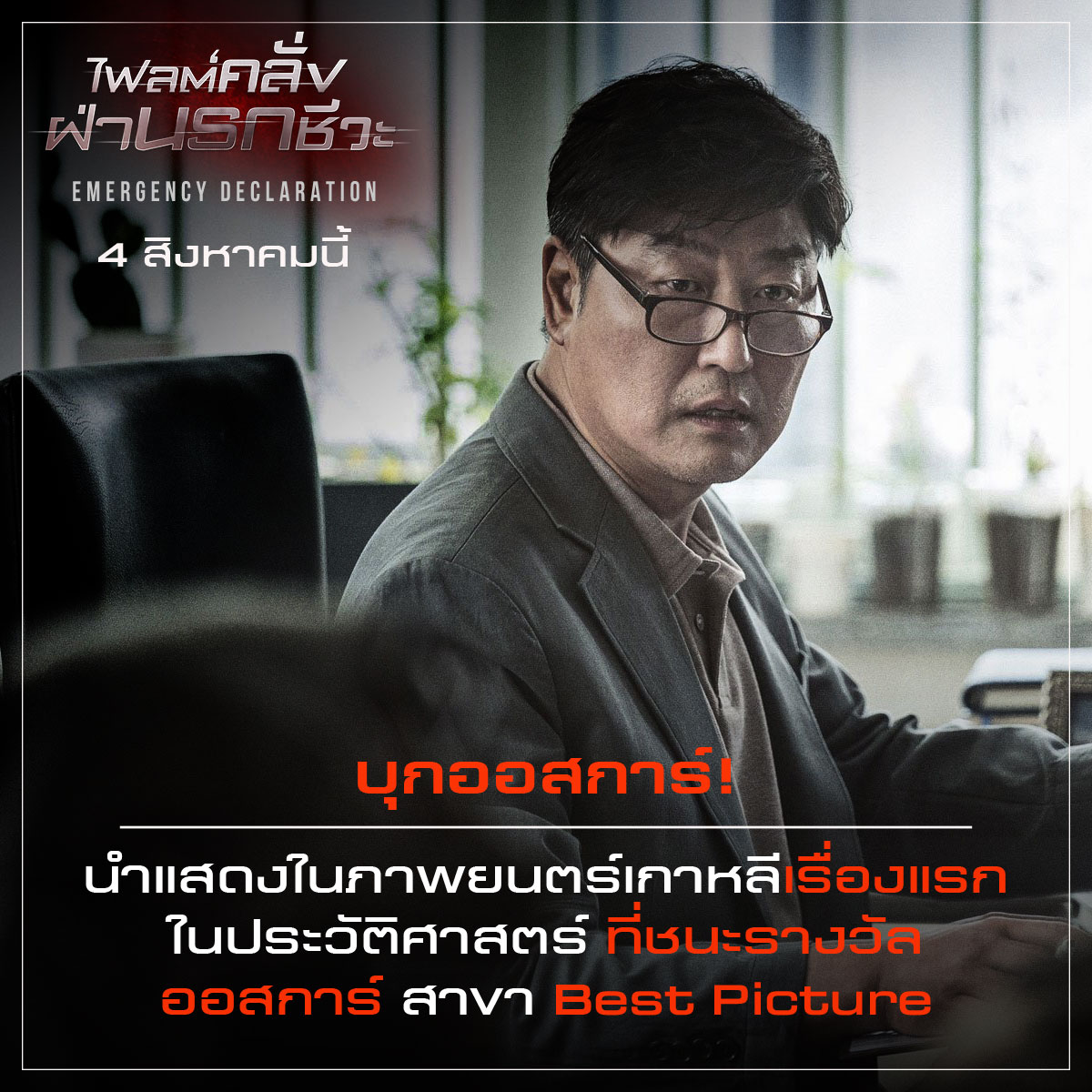 ซงคังโฮ นักแสดงชาย ที่นำแสดงในภาพยนตร์เกาหลีเรื่องแรกที่สร้างประวัติศาสตร์ชนะรางวัล Best Picture บนเวทีสุดยิ่งใหญ่อย่างออสการ์ ด้วยการแสดงที่ทรงพลังและการถ่ายทอดคาแรกเตอร์ออกมาได้อย่างโดดเด่นและมีเอกลักษณ์ของซงคังโฮใน Parasite ทำให้เขากลายเป็นนักแสดงชายเกาหลีใต้ ที่ได้รับกระแสการตอบรับ และเป็นที่ชื่นชอบจนโด่งดังไปทั่วโลก ยิ่งส่งให้ซงคังโฮขึ้นแท่นเป็นนักแสดงมากฝีมืออันดับต้นๆของเกาหลี ที่การันตีความสำเร็จในแง่รายได้ และผู้ชม จนทำให้เขาได้รับบทบาทที่หลากหลาย รวมถึงอีกคาแรกเตอร์สำคัญที่คุณจะได้ชมการแสดงอันยอดเยี่ยมของเขาในเร็วๆนี้ คือบทบทของ อินโฮ ตำรวจสืบสวนมากประสบการณ์ ต้องเจอกับเคสที่หินสุดในชีวิตซึ่งรับรองว่าซงคังโฮจะโชว์ความสามารถทางการแสดงอันยอดเยี่ยมให้ทุกคนได้อึ้งอีกครั้ง ในหนังหายนะฟอร์มยักษ์ที่กำลังจะเข้าฉายอย่าง Emergency Declaration แน่นอน