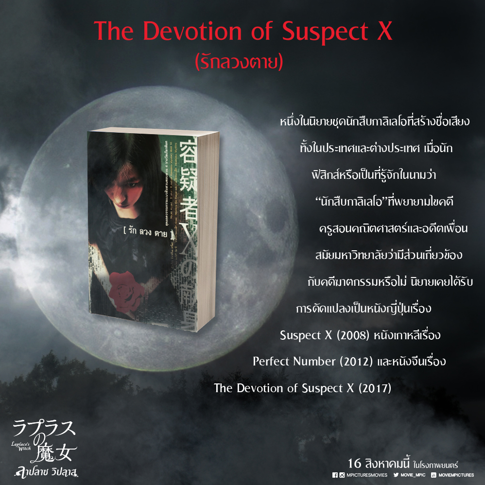 หนึ่งในนิยายชุดนักสืบกาลิเลโอที่สร้างชื่อเสียงทั้งในประเทศและต่างประเทศ เล่าเรื่องของยุคาวะ มานาบุ นักฟิสิกส์หรือเป็นที่รู้จักในนามว่า “นักสืบกาลิเลโอ” ที่พยายามไขคดีว่าเท็ตสึยะ อิชิงามิ ครูสอนคณิตศาสตร์และอดีตเพื่อนสมัยมหาวิทยาลัย ว่ามีส่วนเกี่ยวข้องกับคดีฆาตกรรมหรือไม่ นิยายเคยได้รับการดัดแปลงเป็นหนังญี่ปุ่นเรื่อง Suspect X (2008) หนังเกาหลีเรื่อง Perfect Number (2012) และหนังจีนเรื่อง The Devotion of Suspect X (2017)