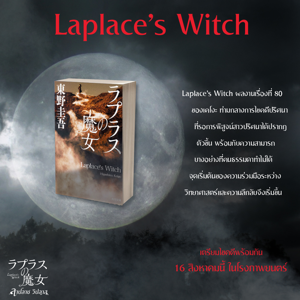Laplace’s Witch ถือเป็นผลงานเรื่องที่ 80 ในชีวิตการทำงานของเคโงะ เมื่อคนสองคนเสียชีวิตเพราะการสูดก๊าซไฮโดรเจนซัลไฟด์ที่เกิดขึ้นกันคนละสถานที่ ตำรวจจึงต้องพึ่งความเห็นของนักวิเคราะห์สิ่งแวดล้อม ชูสุเกะ อาโอเอะเพื่อพิสูจน์ว่าทั้งสองคดีคืออุบัติเหตุหรือการฆาตกรรม ในระหว่างการสืบสวน ชูสุเกะได้พบกับสาวน้อยปริศนา มาโดกะ อุฮาระ เธอสามารถทำนายสถานที่เกิดปรากฏการณ์ได้อย่างแม่นยำ จุดเริ่มต้นของความร่วมมือระหว่างวิทยาศาสตร์และความลึกลับจึงเริ่มขึ้น นิยายเรื่องนี้ได้กลายเป็นภาพยนตร์ญี่ปุ่นที่กำกับโดย ทาคาชิ มิอิเกะ ซึ่งกำลังจะเข้าฉายในบ้านเรา 16 สิงหาคมนี้