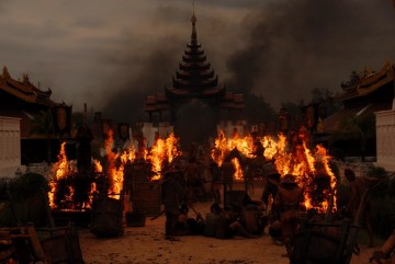 “ สำหรับในการถ่ายทำฉากนี้ เรามีการถ่ายทำอยู่หลายวัน เพราะบางครั้งเวลาที่เราถ่ายทำไปแล้วมันไม่ได้ครับ คือไฟจุดแล้วมันไม่ลุกมาก หรือบางทีจุดแล้วมันลุกมากเกินมัน ทำให้ตัวแสดงที่ถูกมัดอยู่ร้อนจริง แล้วก็ใช้คนประมาณ500คน คือนอกเหนือจากคนที่ถูกเผาแล้ว มันต้องมีทหารพม่าที่ทำหน้าที่เผา คือมันจะมีความวุ่นวายเกิดขึ้นในท้องพระโรง การขอชีวิตอะไรอย่างนี้ แล้วก็ความวุ่นวายของคน500คนในการมาถ่ายทำ บางทีเล่นแล้วก็มีการเหลือบมองคนเหลือบมองดูกล้อง ไม่เข้ามาร์ก ไปบังตัวเมน คือชุลมุนวุ่นวายไปหมดครับ แล้วพอบางครั้งเวลาจุดไฟ ตอนซ้อมมันยังไม่มีไฟ พอเอาจริงพอไฟมันขึ้นมาปั๊บ คนที่ต้องไปจุดอีกทีเข้าไปก็ไม่กล้าเข้า พอไม่กล้าเข้า ทางด้านภาพก็ไม่ได้ อย่างนี้นะครับ จริงๆมันมีความยากอีกอย่างหนึ่งคือเราต้องมีคอมพิวเตอร์กราฟฟิกเข้ามาช่วย เพราะฉะนั้นท่านมุ้ยจะมองไปเลยว่าฉากตรงนี้รูตรงนี้ จะต้องเอากรีนสกรีนมาขึง เพราะว่าภายหลังจากตรงนี้ไปจะเห็นเป็นกำแพงนะ จะเห็นยอดเจดีย์ตรงนี้นะครับ ภาพทั้งหมดมันเป็นภาพที่เขียนมาแล้วครับว่าจะมีเจดีย์ขึ้นตรงไหน ทหารจะคุมจากตรงไหนบ้าง เวลาถ่ายลมแรง ก็จะพัดผ้ากรีนเกิดเป็นเงา ต้องไปขึงผ้ากรีนขึ้นใหม่ บางทีพอถ่ายเสร็จปั๊บเงาก็ไปติดที่อยู่ตามผ้ากรีนอีก ก็ต้องจัดแสงใหม่ คือถึงแม้ว่าเราจะมีเทคโนโลยีมาแล้ว มันก็มาพร้อมกับความยากลำบากพอสมควร การถ่ายทำสำหรับฉากนี้ฉากเดียวก็ถ่ายทำเป็นอาทิตย์ละครับ”