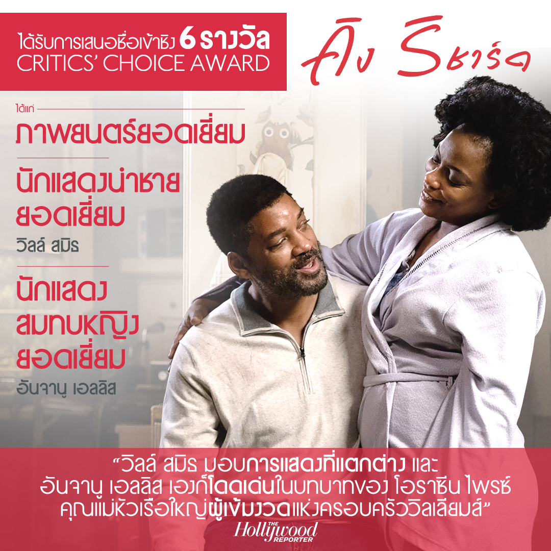 ก่อนที่จะพบกับภาพยนตร์ที่สร้างขึ้นอิงจากเรื่องจริงที่จะสร้างแรงบันดาลใจให้ทั้งโลก "King Richard - คิง ริชาร์ด" ที่เตรียมเข้าฉายในบ้านเรา 17 กุมภาพันธ์นี้ ไปพบกับคลิปเบื้องหลังที่จะทำให้คุณเข้าใจถึงเรื่องราวของ 2 นักกีฬาก่อนจะก้าวเข้ามาเปลี่ยนแปลงงวงการกีฬาเทนนิสตลอดกาล การันตีด้วยการได้รับการเสนอชื่อเข้าชิงและรางวัลยอดเยี่ยมมากมายหลายเวที หลายสาขา ไม่ว่าจะเป็น ผู้กำกับภาพยนตร์ยอดเยี่ยม (เรนัลโด้ มาร์คัส กรีน), นักแสดงนำชายยอดเยี่ยม (วิลล์ สมิธ), นักแสดงสมทบหญิงยอดเยี่ยม (อันจานู เอลลิส)