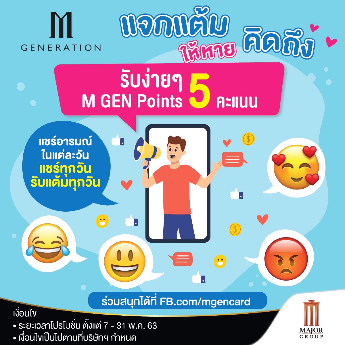 สมาชิก M GEN ร่วมสนุกแชร์อารมณ์ที่รู้สึกในแต่ละวัน โดยคลิกลิงค์กิจกรรม ใน Facebook M GEN สมาชิกรับ M GEN Points 5 คะแนน / วัน