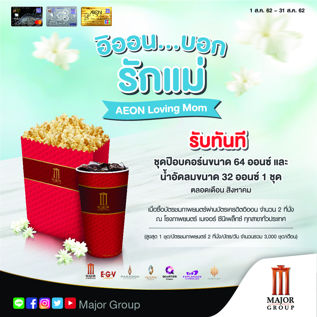 1.สิทธิพิเศษสำหรับผู้ถือบัตรเครดิตอิออนทุกประเภท (ยกเว้นบัตรเครดิตเพื่อองค์กร) ที่ออกโดยบริษัท อิออน ธนสินทรัพย์ (ไทยแลนด์) จำกัด (มหาชน) (“บริษัทฯ”) เท่านั้น เมื่อซื้อบัตรชมภาพยนตร์ผ่านบัตรเครดิตอิออน จำนวน 2 ที่นั่ง ณ โรงภาพยนตร์ในเครือ เมเจอร์ ซีนีเพล็กซ์ ทุกสาขาทั่วประเทศ ระหว่างวันที่ 1-31 ส.ค. 62