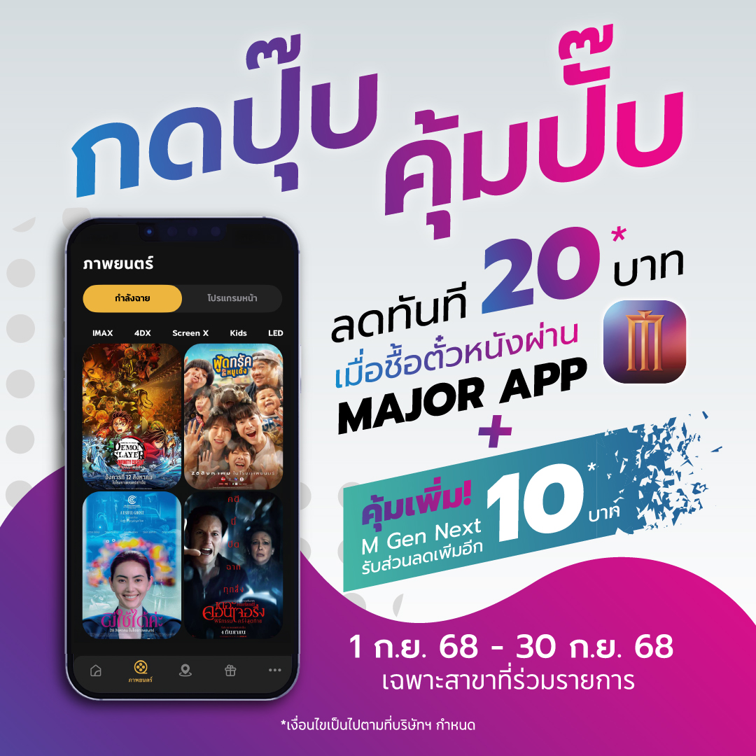 “กดปุ๊บ คุ้มปั๊บ” รับส่วนลด 20 บาท เมื่อซื้อบัตรชมภาพยนตร์ผ่าน Major App ระหว่าง 1 ก.ย. 68 - 30 ก.ย. 68