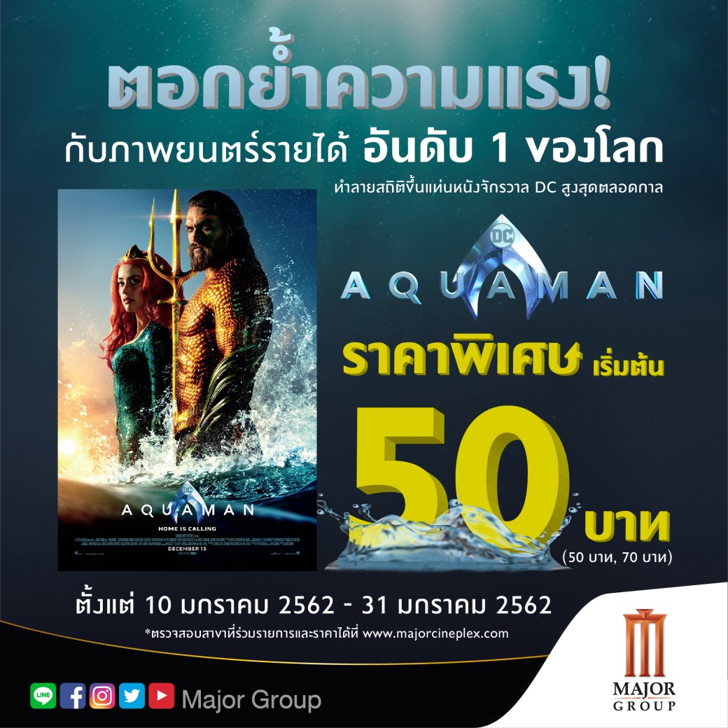 - รับสิทธิ์ชมภาพยนตร์ “AQUAMAN” ตามราคาที่แต่ละสาขากำหนด ในราคาปกติ / ที่นั่งปกติเท่านั้น (ที่นั่ง HONEYMOON SEAT เพิ่มเงิน 20 บาท ต่อที่นั่ง)