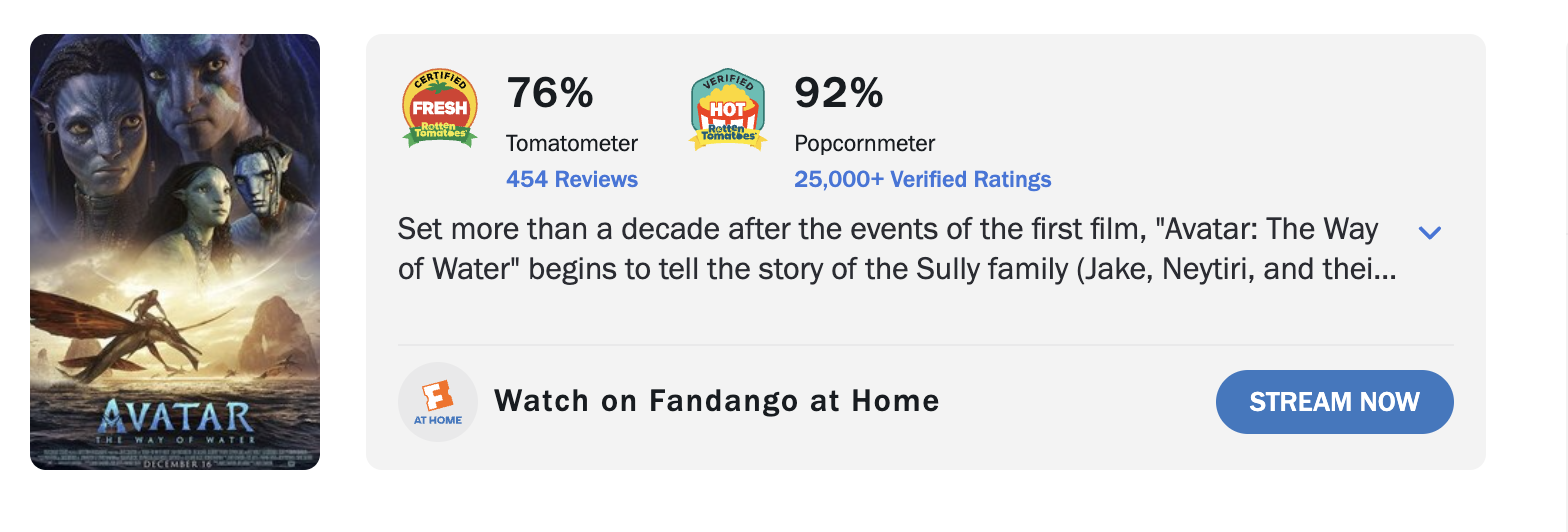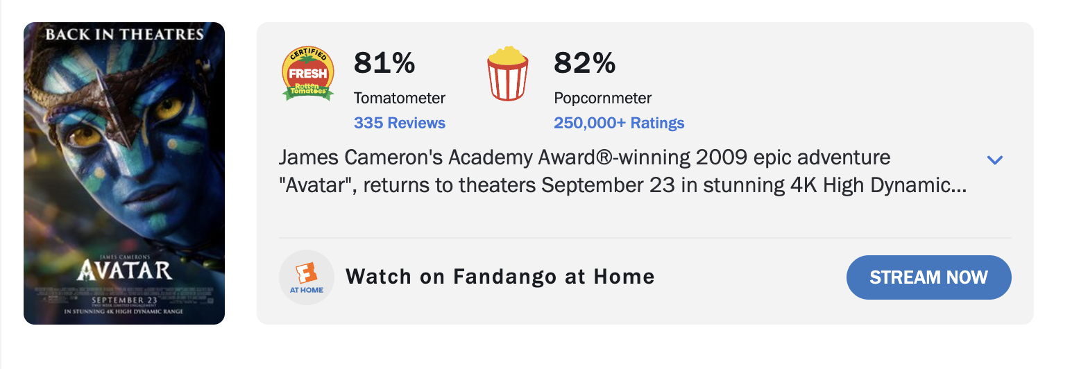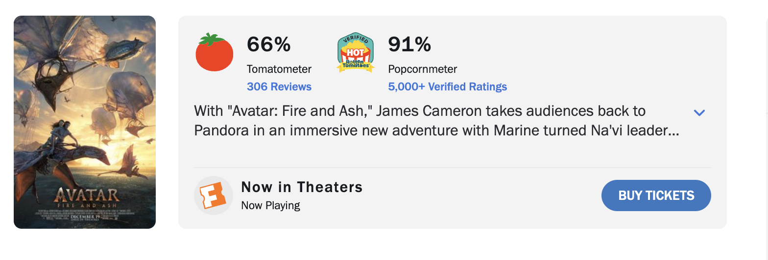 หลังจากภาพยนตร์ภาคที่สามของแฟรนไชส์ Avatar เข้าฉายไปได้แล้วประมาณสองสัปดาห์ ก็หมายความว่าคะแนนและเสียงตอบรับของเว็บไซต์ต่าง ๆ ของภาพยนตร์เรื่องดังกล่าวก็จะเริ่มที่จะนิ่งและแสดงผลในแบบที่มันควรจะเป็นแล้ว และก็ถึงเวลาที่เราจะได้เทียบกันเสียที ว่าภาพยนตร์ภาคไหนในแฟรนไชส์นี้ที่ถูกใจผู้ชมและนักวิจารณ์มากที่สุด โดยอ้างอิงข้อมูลจากเว็บไซต์ รอตเทนโทเมโทส์