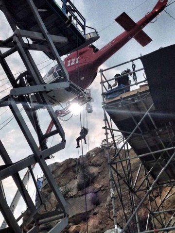 ในฉากตอนต้นที่แสดงถึงความสามารถ ความเป็นห่วงเป็นใย และสติที่มั่นคงของเรย์ เขาและทีมเฮลิคอปเตอร์ได้ช่วยคนขับรถซึ่งรถลื่นไถลออกจากถนนและกำลังจะตกหน้าผา ด้วยการสร้างฉากภายนอกขนาด 50x50 ฟุตที่สถานที่ถ่ายทำในออสเตรเลีย ฉากดังกล่าวได้รับการจำลองอย่างละเอียดเพื่อใช้แทนถนนในเขตทิวเขาซานตาโมนิกา ตัวแบบได้จากเหมืองหินที่อยู่ใกล้กันโดยใช้โฟมทำขึ้นมาองค์ประกอบเหล่านี้ติดอยู่กับโครงไม้ซึ่งมีฐานคอนกรีตเอาไว้ให้นักแสดงเหยียบและถุงดินเพื่อวางต้นไม้ลงไป