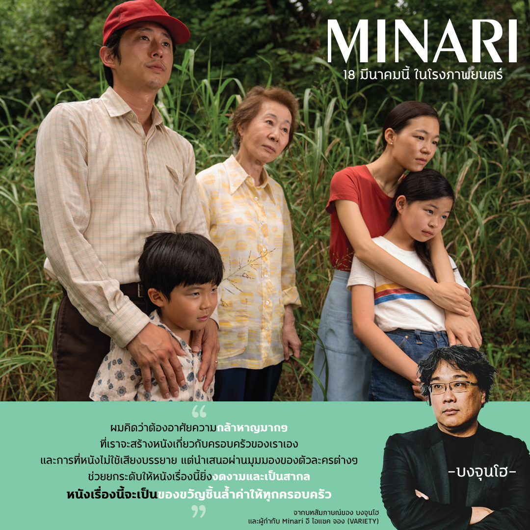 นับเป็นการส่งไม้ต่อบนเวทีรางวัลของผู้กำกับเลือดเกาหลีที่ทำให้คอหนังทั้งโลกต้องจับตามองเลยก็ว่าได้ ส่วนแฟน ๆ ชาวไทยได้ดูแน่นอน เตรียมออกเดินทางไปกับครอบครัวชาวเกาหลีในยุค 80 พวกเขาหอบเอาความหวังไปตั้งต้นชีวิตใหม่บนแผ่นดินอเมริกา เผชิญบททดสอบของการไขว่คว้าความฝัน ไปพร้อมกับการทบทวนรกรากของตนเอง MINARI มินาริ 18 มีนาคมนี้ ในโรงภาพยนตร์