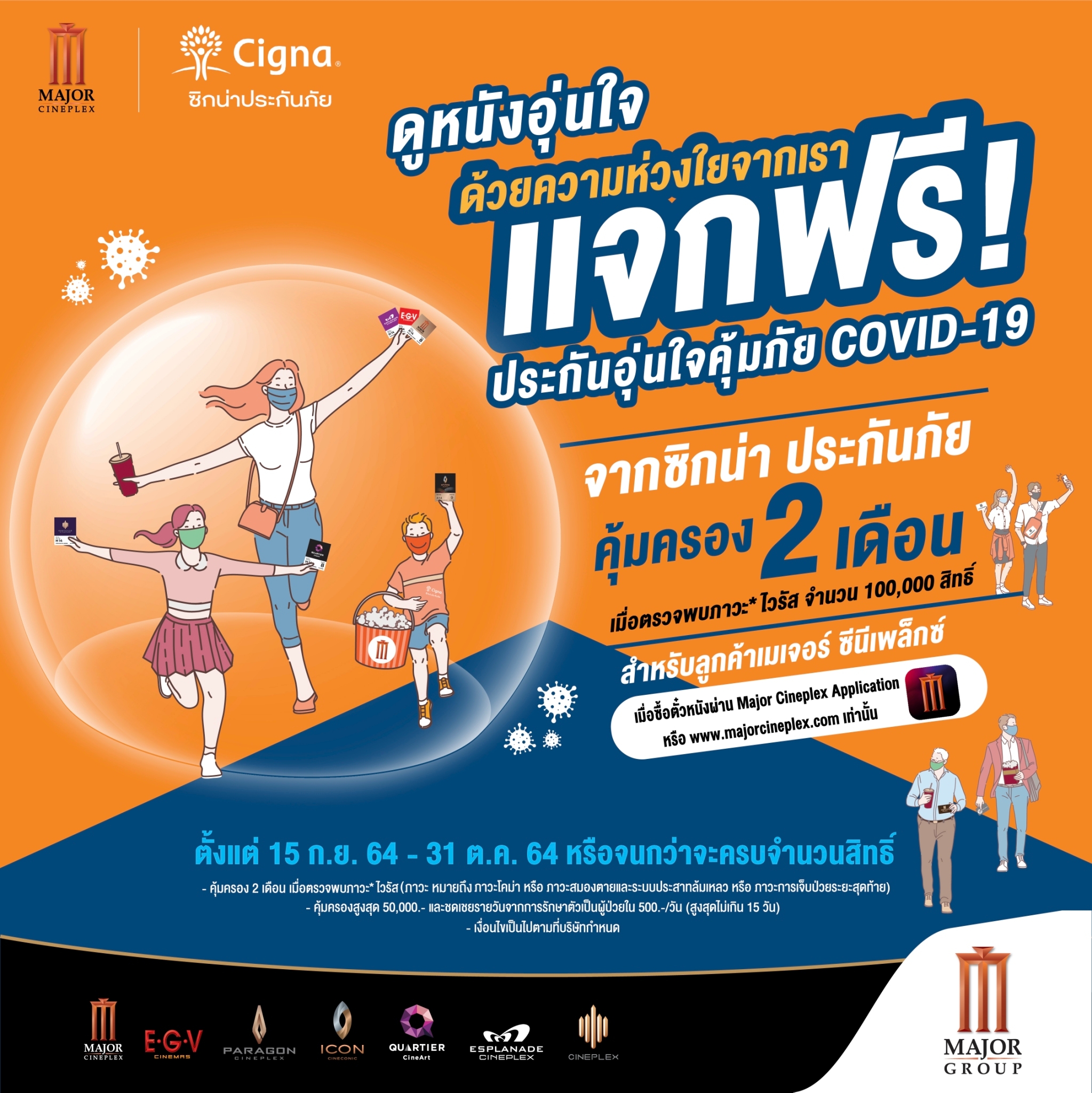เมเจอร์ ซีนีเพล็กซ์ กรุ้ป จำกัด (มหาชน) ร่วมกับ ซิกน่า ประกันภัย จำกัด (มหาชน) มอบสิทธิพิเศษสำหรับลูกค้า โรงภาพยนตร์เครือเมเจอร์ ซีนีเพล็กซ์ ทุกสาขา ทั่วประเทศ เมื่อซื้อบัตรชมภาพยนตร์ผ่าน Major Cineplex Application หรือ Website www.majorcineplex.com รับฟรีประกันอุ่นใจคุ้มภัย Covid-19 จาก ซิกน่าประกันภัย* จำนวน 100,000 สิทธิ์ ตั้งแต่วันที่ 15 กันยายน 2564 – 31 ตุลาคม 2564 (หรือจนกว่าจะครบจำนวนสิทธิ์) รายละเอียด ดังนี้