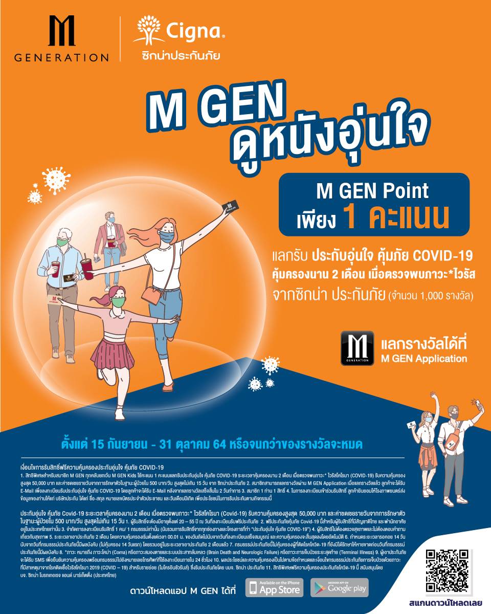 1. สิทธิพิเศษสำหรับสมาชิก M GEN ทุกคลับยกเว้น M GEN Kids ใช้คะแนน 1 คะแนนแลกรับประกันอุ่นใจ คุ้มภัย COVID-19 ระยะเวลาคุ้มครองนาน 2 เดือน เมื่อตรวจพบภาวะ *ไวรัสโคโรนา (COVID-19) รับความคุ้มครองสูงสุด 50,000 บาท และค่าชดเชยรายวันจากการรักษาตัวในฐานะผู้ป่วยใน 500 บาท/วัน สูงสุดไม่เกิน 15 วัน จาก ซิกน่าประกันภัย