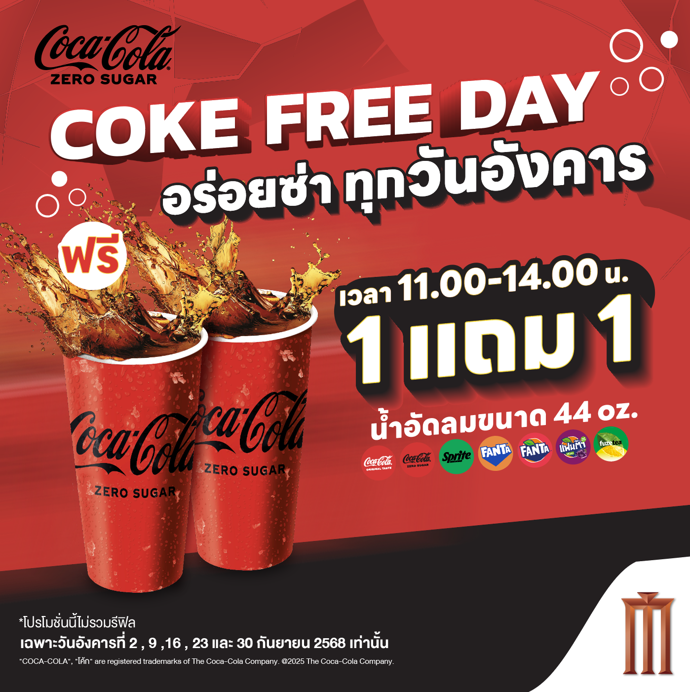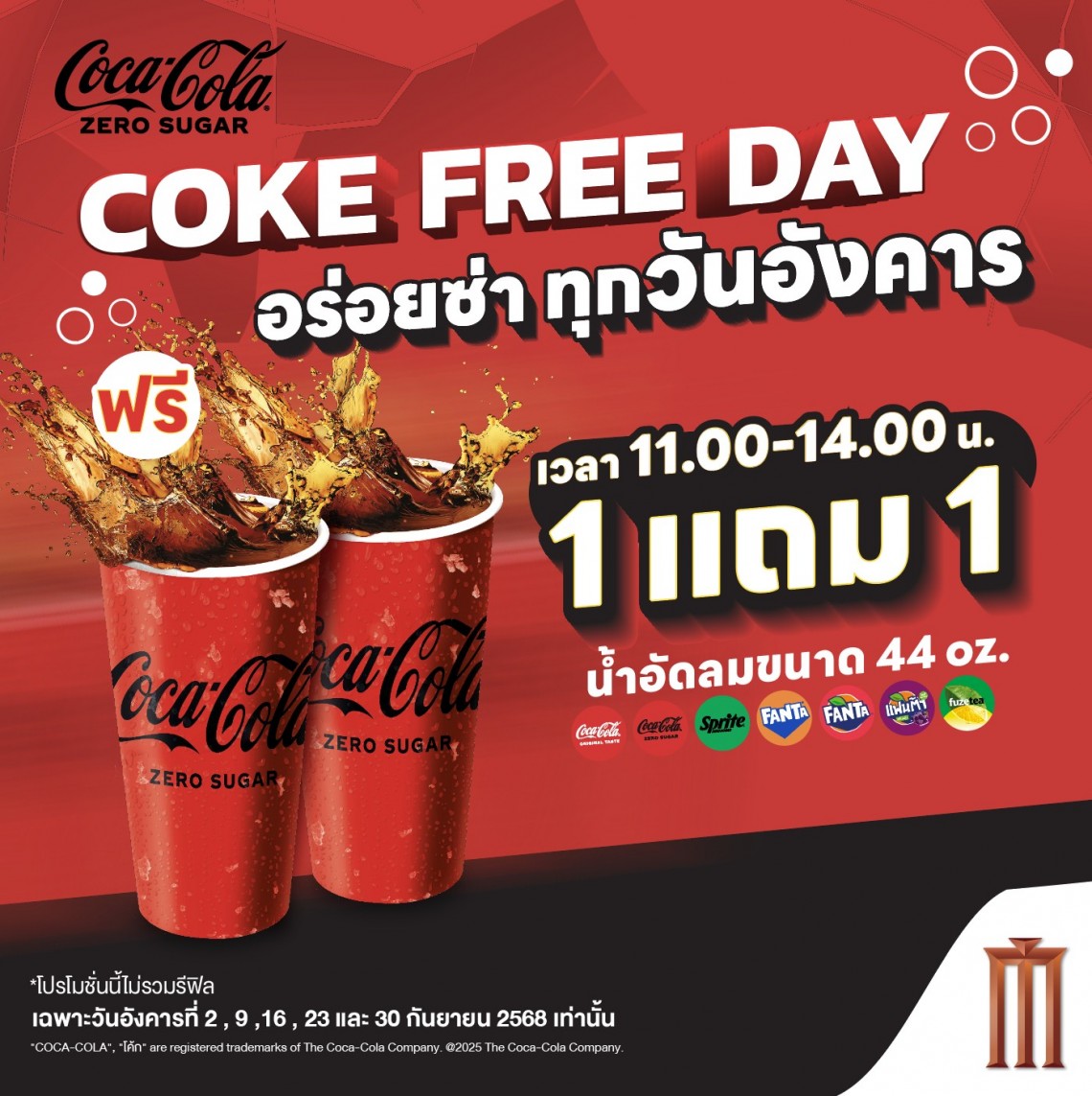• ทุกวันอังคาร เวลา 11.00–14.00 น. COKE FREE DAY ซื้อ 1 แถม 1 น้ำอัดลม 44 oz.