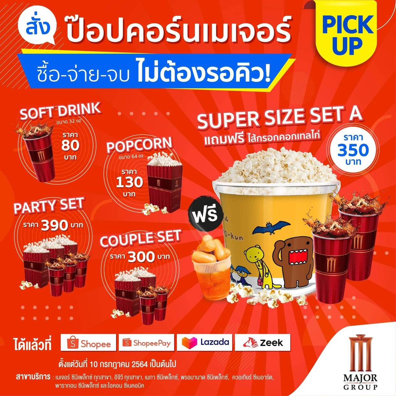 ซื้อง๊ายง่ายย ซื้อ-จ่าย-จบ ไม่ต้องรอคิว!! Major Cineplex Popcorn - Pick Up กับรายการเมนูขายดีตลอดกาล Supersize Set A แถมฟรีไส้กรอก 1 ถ้วย  ราคา 350 บาท, Party Set ราคา 390 บาท, Couple Set  ราคา 300 บาท, Popcorn 64 Oz. ราคา 130 บาท, Popcorn 85 Oz. ราคา 150 บาท, Soft Drink 32 Oz. ราคา 80 บาท, Soft Drink 44 Oz. ราคา 90 บาท