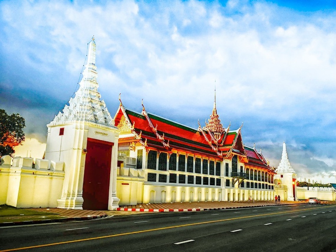 พระบาทสมเด็จพระเจ้าอยู่หัว เสด็จออกสีหบัญชร พระที่นั่งสุทไธสวรรยปราสาท ทหารกองเกียรติยศ ๓ เหล่าทัพถวายความเคารพ วงดุริยางค์บรรเลงเพลงสรรเสริญพระบารมี