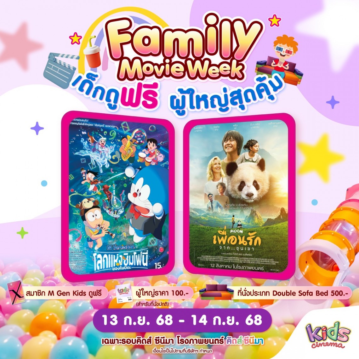 คิดส์ ซีนีมา มอบความสุขให้กับครอบครัวในช่วงวันหยุด ขอเชิญชวนคุณพ่อคุณแม่ และน้องๆ มาสนุกไปกับ Family Movie Week เด็กดูฟรี ผู้ใหญ่สุดคุ้ม ที่มาพร้อมสิทธิพิเศษมากมาย ทั้งโปรโมชัน เด็กดูฟรี สำหรับสมาชิก M Gen Kids และ ผู้ใหญ่สุดคุ้ม ราคาพิเศษเพียง 100 บาท รวมถึงที่นั่ง Double Sofa Bed ในราคา 500 บาทเท่านั้น