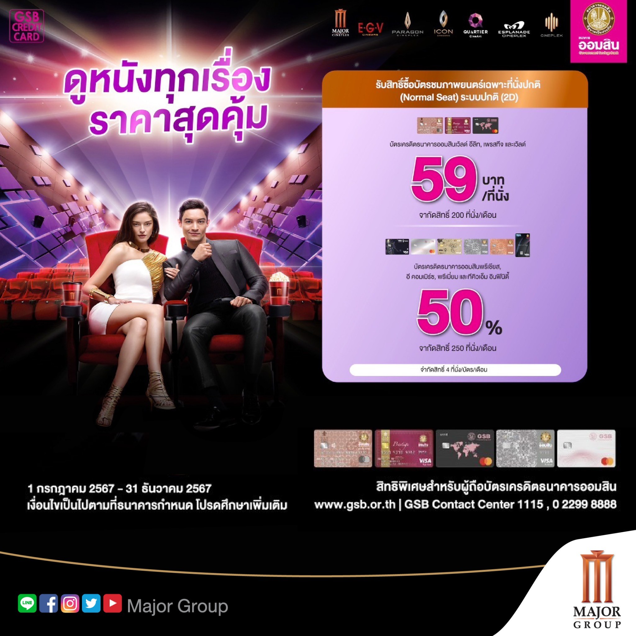 • สิทธิพิเศษสำหรับผู้ถือบัตรเครดิตธนาคารออมสิน พรีเชียส, อี คอมเมิร์ซ, พรีเมี่ยม และทีคิวเอ็ม อินฟินิตี้ รับสิทธิ์ซื้อบัตรชมภาพยนตร์เฉพาะที่นั่งปกติ (Normal Seat) ในราคา 50% จากราคาปกติ