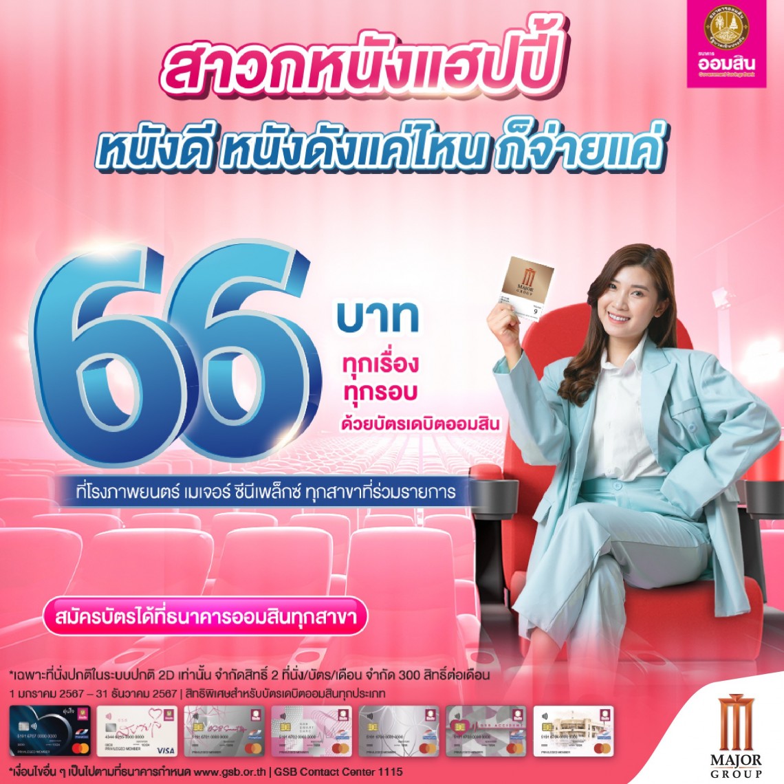 • สิทธิพิเศษสำหรับผู้ถือบัตรเดบิตธนาคารออมสินทุกประเภท รับสิทธิพิเศษใช้บัตรเดบิต ซื้อตั๋วหนังด้วยบัตรเดบิตในราคา 66 บาท