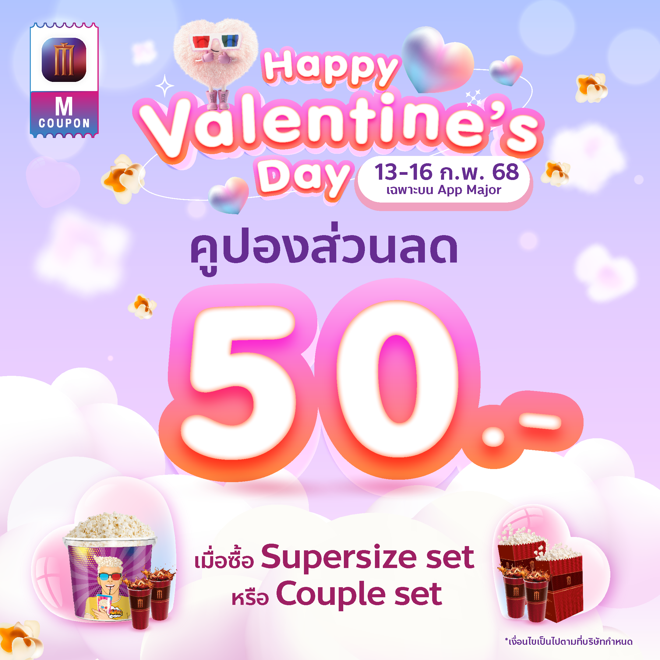 Happy Valentine's Day “ ส่วนลด 50 บาท ” เมื่อซื้อชุด Supersize set หรือ Couple set เฉพาะบน Major App เท่านั้น