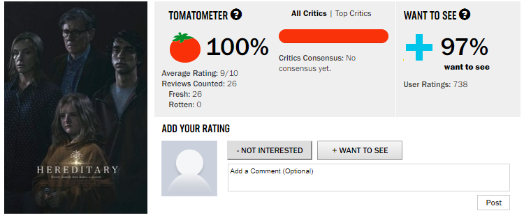 ในตอนนี้ Hereditary ได้กลายเป็นหนังที่ได้รับคำวิจารณ์และเสียงชื่นชมจากนักวิจารณ์ที่ดีที่สุดในปีนี้จากเทศกาลหนัง Sundance อีกทั้งในเว็บให้คะแนนหนังชื่อดังอย่าง Rotten Tomatoes ในตอนนี้(วันที่ 18 เมษายน) ก็ยังคงได้คะแนนไปเต็ม 100% จากนักวิจารณ์ทั้งหมด 26 คน