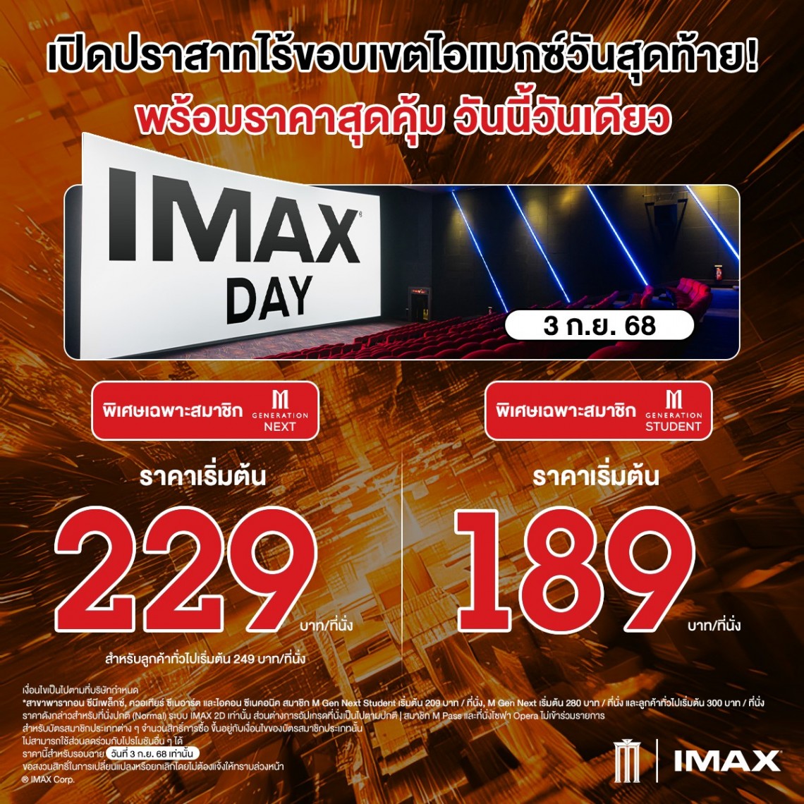 ราคาพิเศษ IMAX Day สำหรับชมภาพยนตร์ระบบ IMAX with Laser และ IMAX ทุกสาขา วันที่ 3 ก.ย. 2568 เท่านั้น