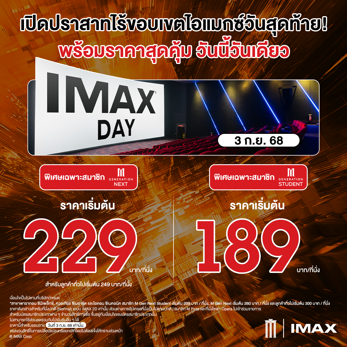 2. สำหรับสมาชิก M Gen Next ที่นั่งปกติ (Normal) ระบบ IMAX 2D เริ่มต้น 229 บาทต่อที่นั่ง (พารากอน ซีนีเพล็กซ์, ควอเทียร์ ซีเนอาร์ต และไอคอน ซีเนคอนิค เริ่มต้น 280 บาทต่อที่นั่ง)