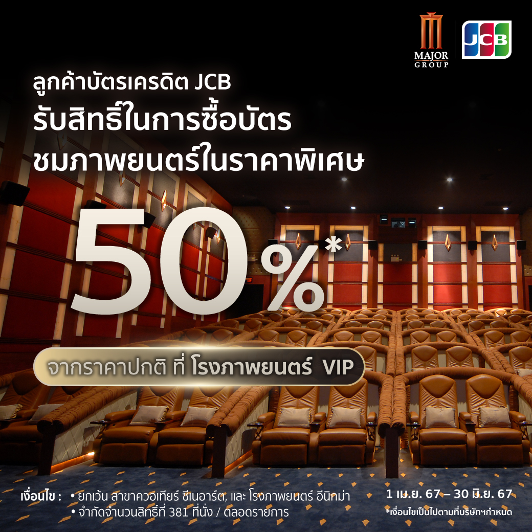 พิเศษเฉพาะบัตรเครดิต JCB Ultimate รับสิทธิ์ในการซื้อบัตรชมภาพยนตร์ในราคาพิเศษ 50% จากราคาปกติ ที่โรงภาพยนตร์ VIP สามารถใช้สิทธิ์ได้ที่จุดจำหน่ายบัตรชมภาพยนตร์ ( counter box-office VIP ) เท่านั้น